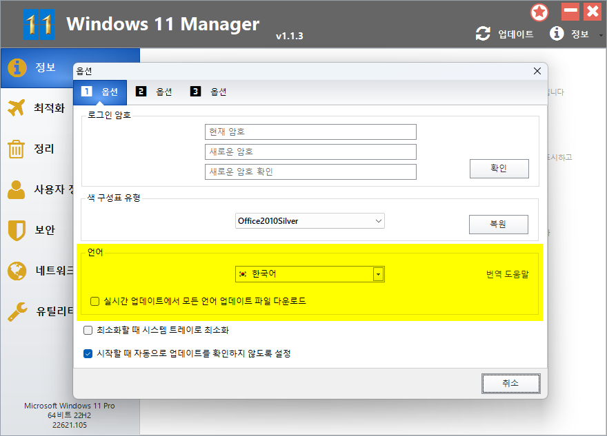 | 최적화 | 시스템 가속화, 부팅 메뉴 관리, 시작 관리, 서비스 및 드라이버 관리, 작업 스케줄러 관리 |