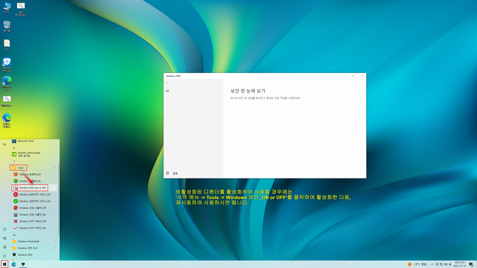 - 디펜더 비활성화(시작메뉴 Tools 폴더에 'Windows 보안_ON or OFF'로 활성화)
