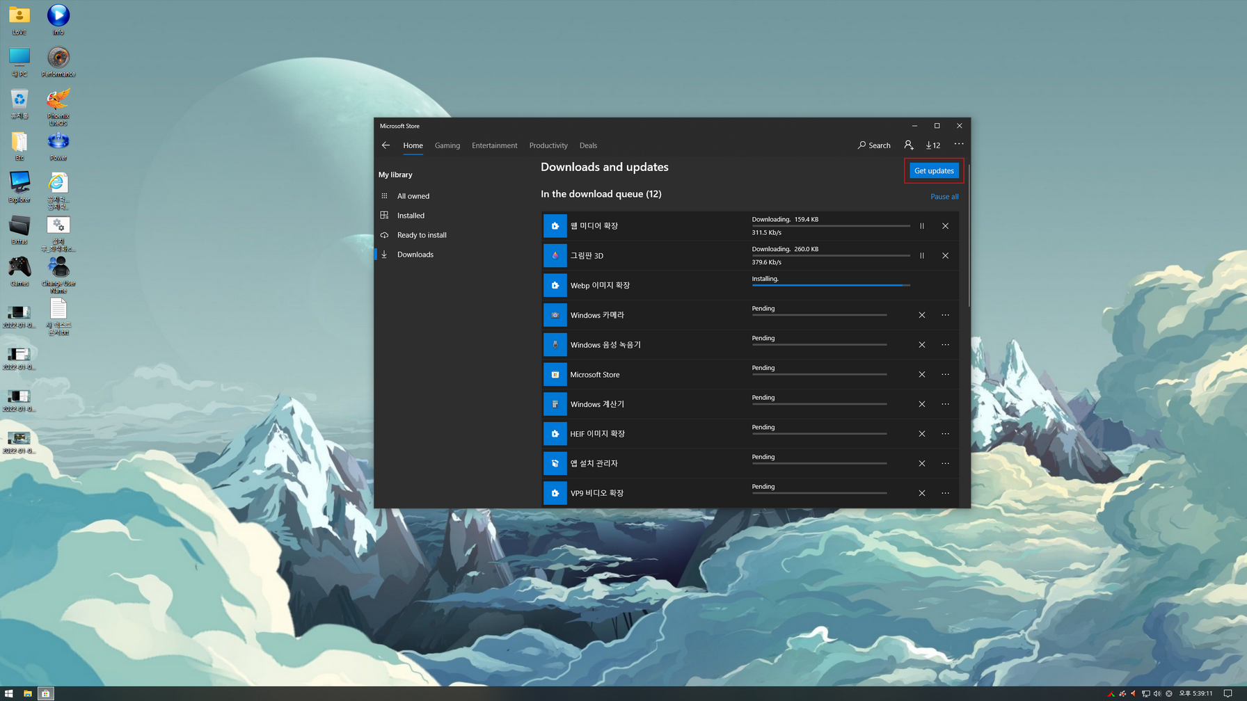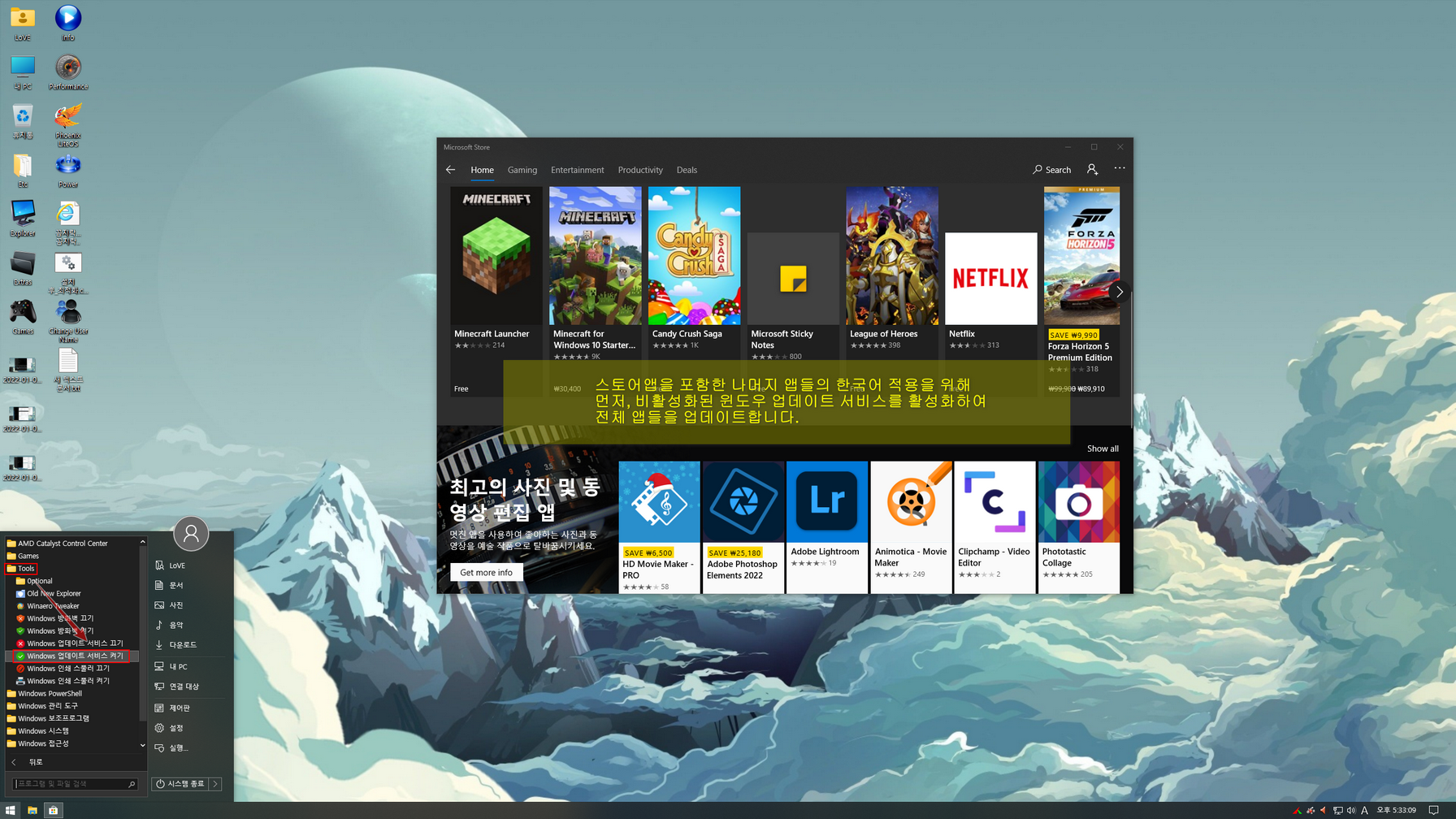 설치는 사용자 계정과 Admin(Administrator) 계정으로 설치할 수 있으며, 용량문제로 *****************.esd 이미지로 마무리합니다. 스토어 앱 및 UWP 앱들의 한국어 적용을 위해서 먼저 비활성된 업데이트 서비스를 활성하고, 그 다음 스토어 앱을 실행하여 모든 앱을 업데이트해 주어야합니다(밑에 캡처 이미지 참고).