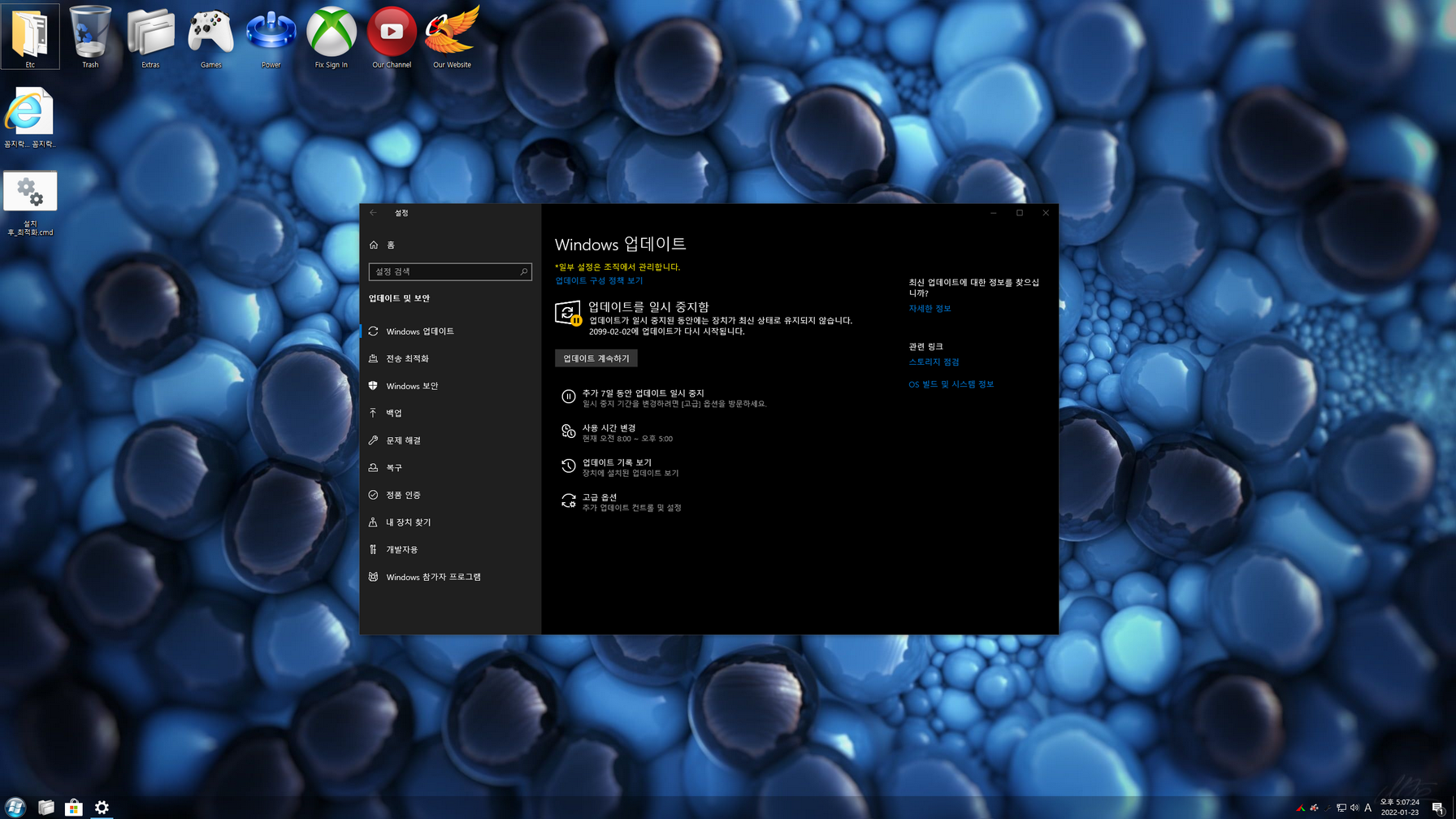 - 자동 업데이트(기능 및 보안) 비활성화(2099년 까지 일시 중지)