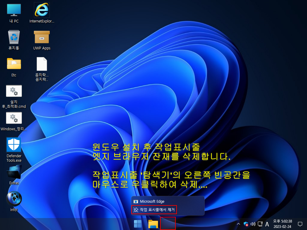 오프라인 한글화 작업이고, 무봉인 윈도우라 한국어 설정을 일부 마무리할 수 없었습니다. 한국어 설정을 위해 첫 바탕화면 진입 후에 바로 배치파일이 실행되고, 10초 후 재부팅됩니다. 재부팅 후에는 작업표시줄에 Edge 브라우저의 잔재가 있으니, 밑에 갭처 이미지를 참고하여 삭제하시기 바랍니다. 그리고 스토어 앱 및 UWP 앱 추가할 경우에도 밑에 캡처 이미지를 참고.....