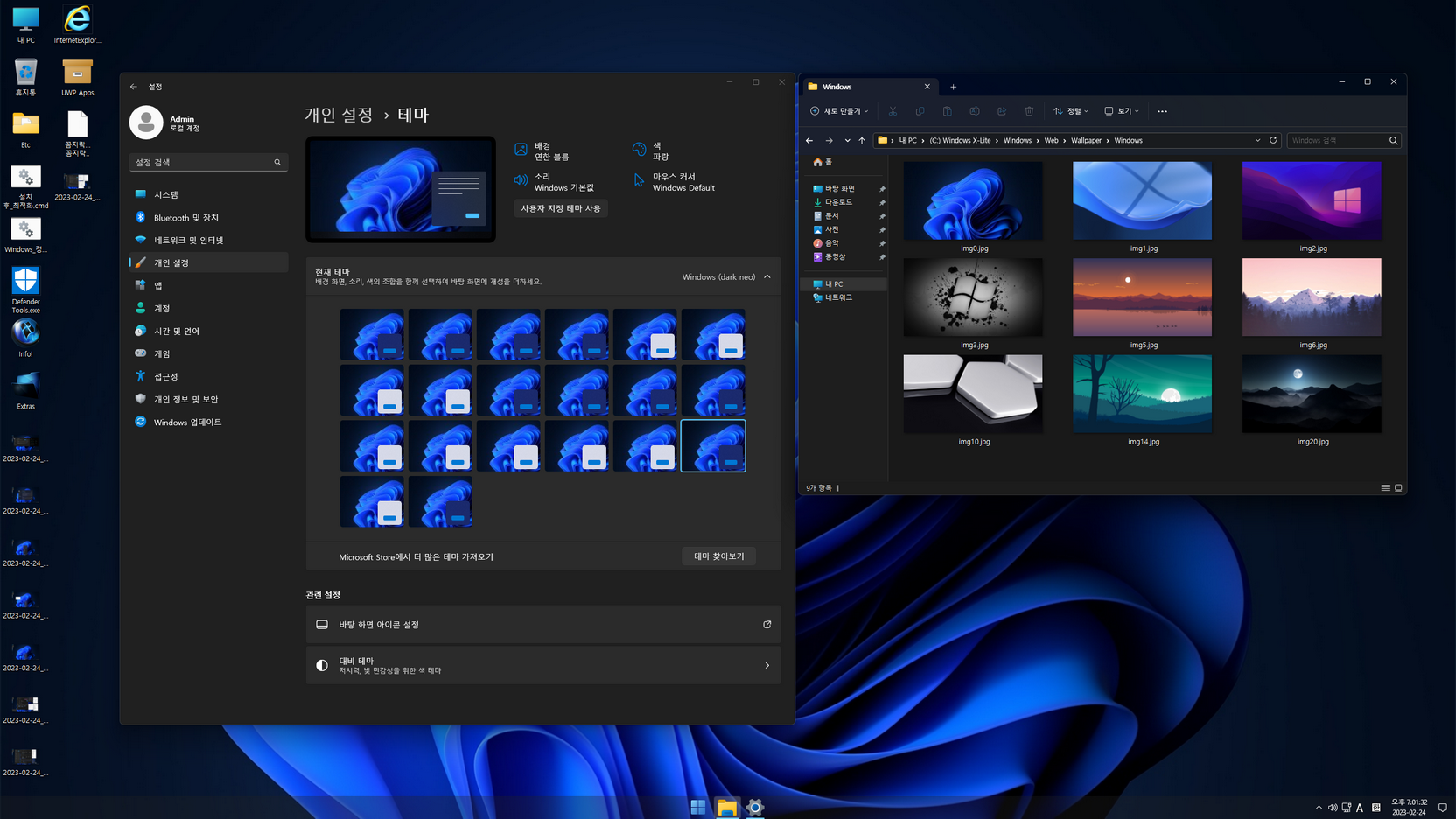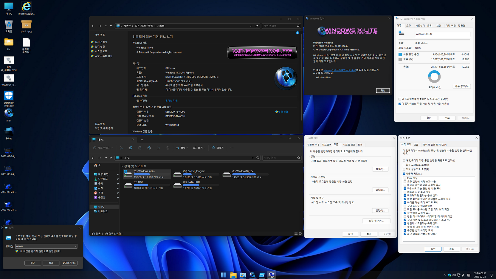 FBConan님 Windows 11 X-Lite (Windows 11 22H2_22621.1265) 버전의 지역화이며, 설치 시 컴팩트(Compact)압축 적용으로 설치 시간이 조금 걸립니다. 4 가지 에디션으로 구성되어 있으며, Admin(사용자 계정, 관리자 권한)으로 무봉인된 라이트 윈도우입니다.