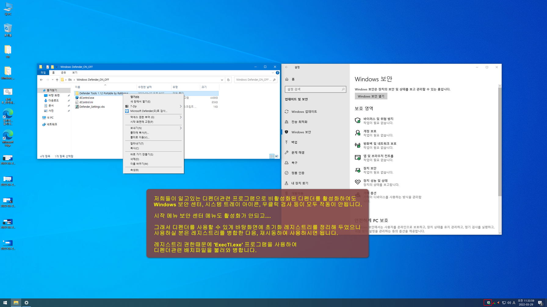 최신 OneSmiLe님 10용 윈도우에서 디펜더를 제대로 사용할 수 없다는 사용자들 피드백에, 공부용으로 한글화 작업을 했습니다. 기본 한글화 후 설치하여 테스트해 보니, 사용자들 말데로 디펜더가 제대로 활성화가 안되는 현상이 나왔습니다.