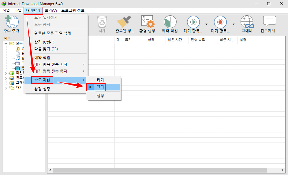 - 마지막으로 메뉴에서 '내려받기 → 속도 제한 → 끄기' 선택