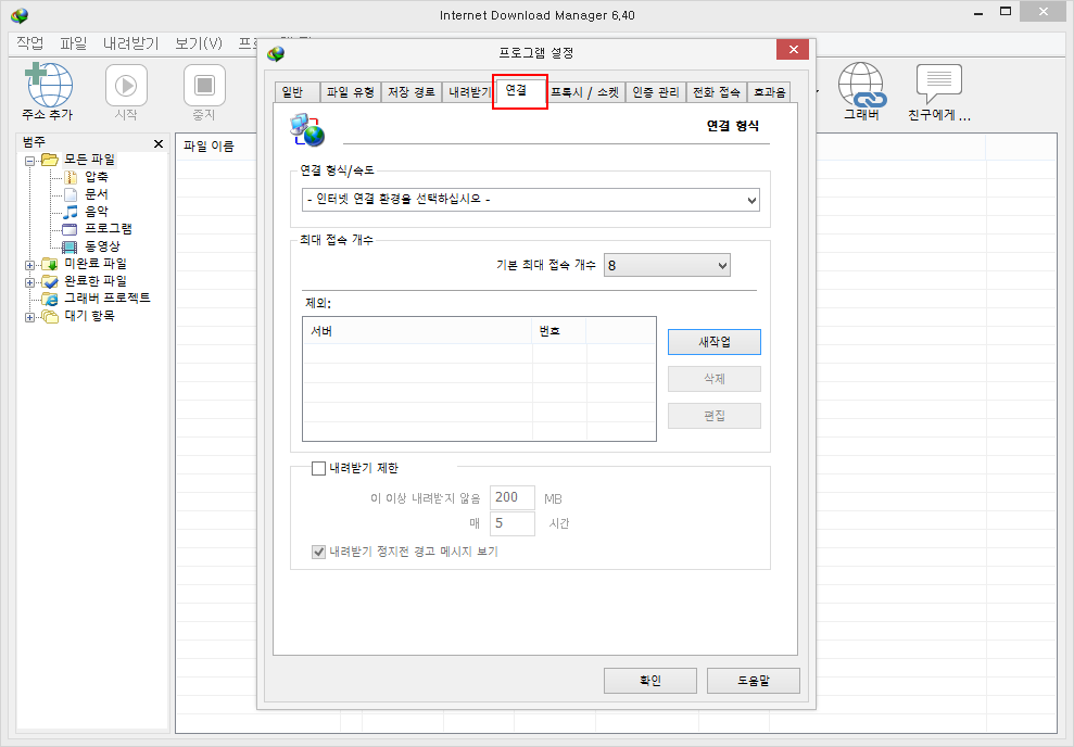 IDM 프로그램의 '환경 설정 → 연결 형식'을 설정하여 다운로드 속도 최적화 - ①