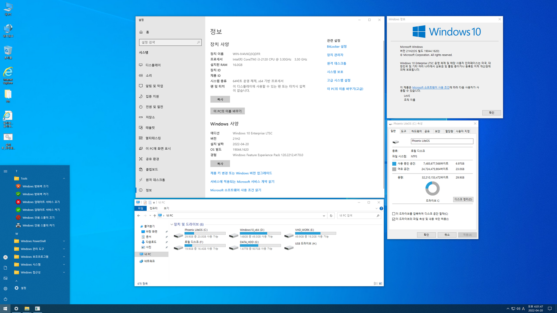 XiuXitong(修系统)님 윈도우 10 LTSC 2021 라이트 버전을 지역화했습니다. 제작자 트윅 소스는 암호화되어 있어서 눈에 보이는 부분까지만 수정했고, WinSXS 폴더가 정리된 윈도우라 누적 업데이트가 불가능한 윈도우입니다.
