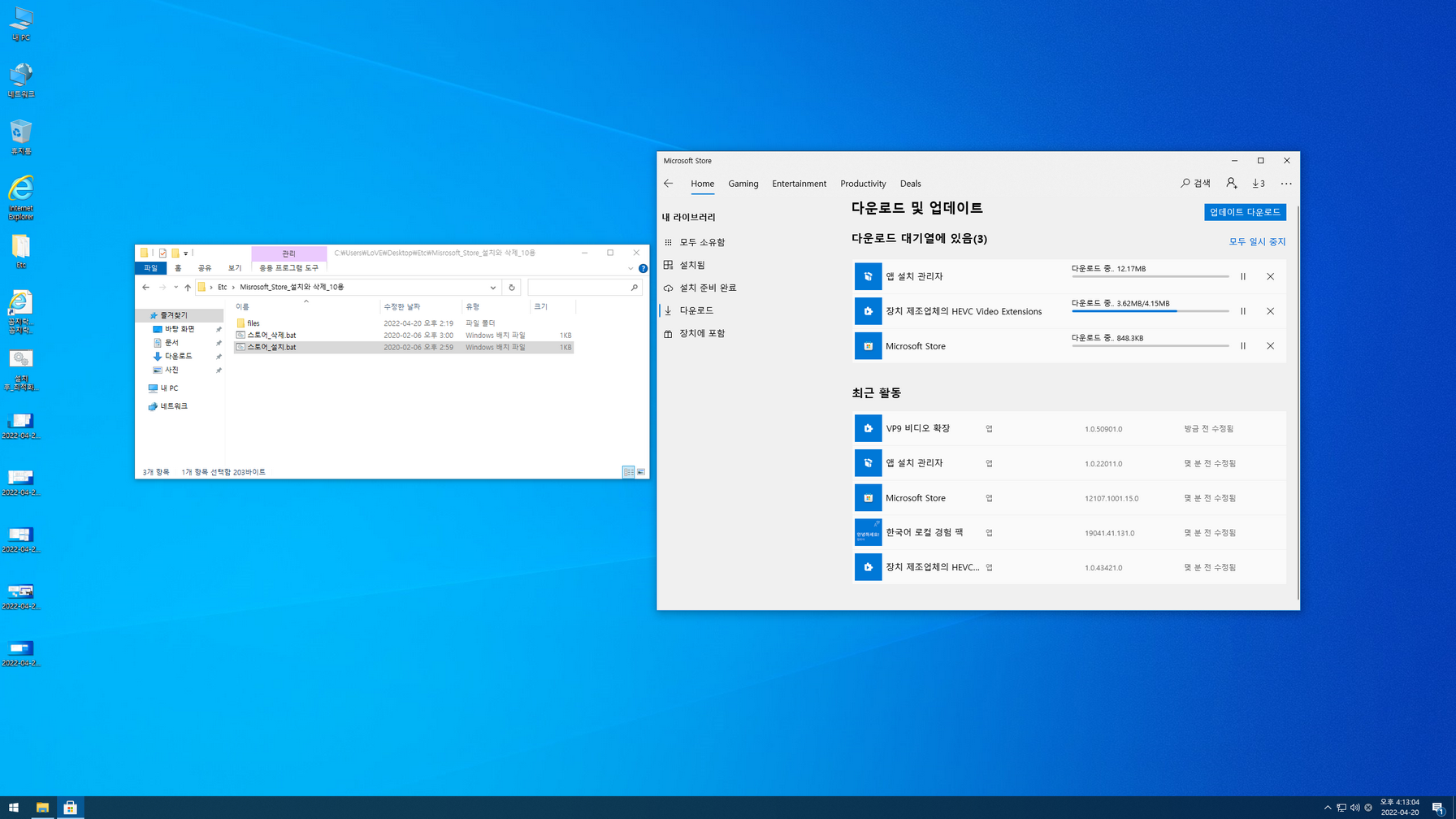 - 스토어 앱 및 HEVC Video 코덱 추가는 바탕화면 'Etc' 폴더에서 밑에 캡처 이미지를 참고하면 됨.