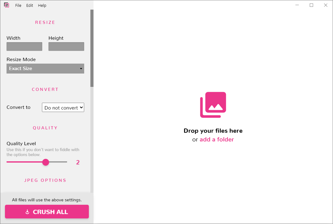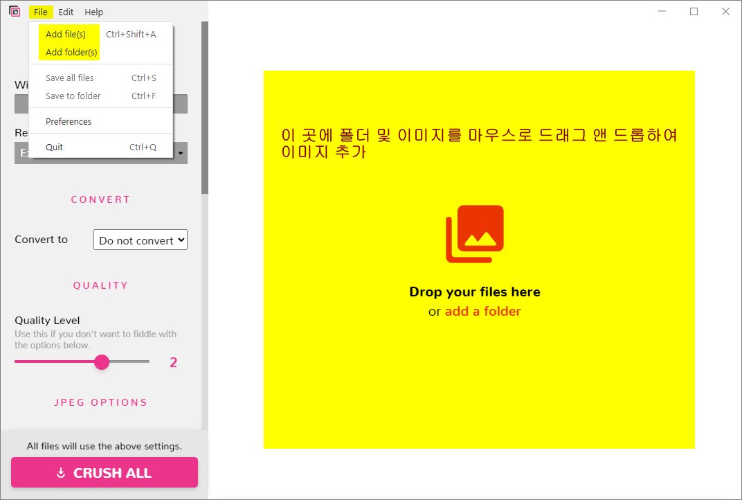 - 크러시(Crushee)를 시작한 후, 이미지가 있는 폴더 및 파일을 선택하여 마우스로 드래그 앤 드롭하거나