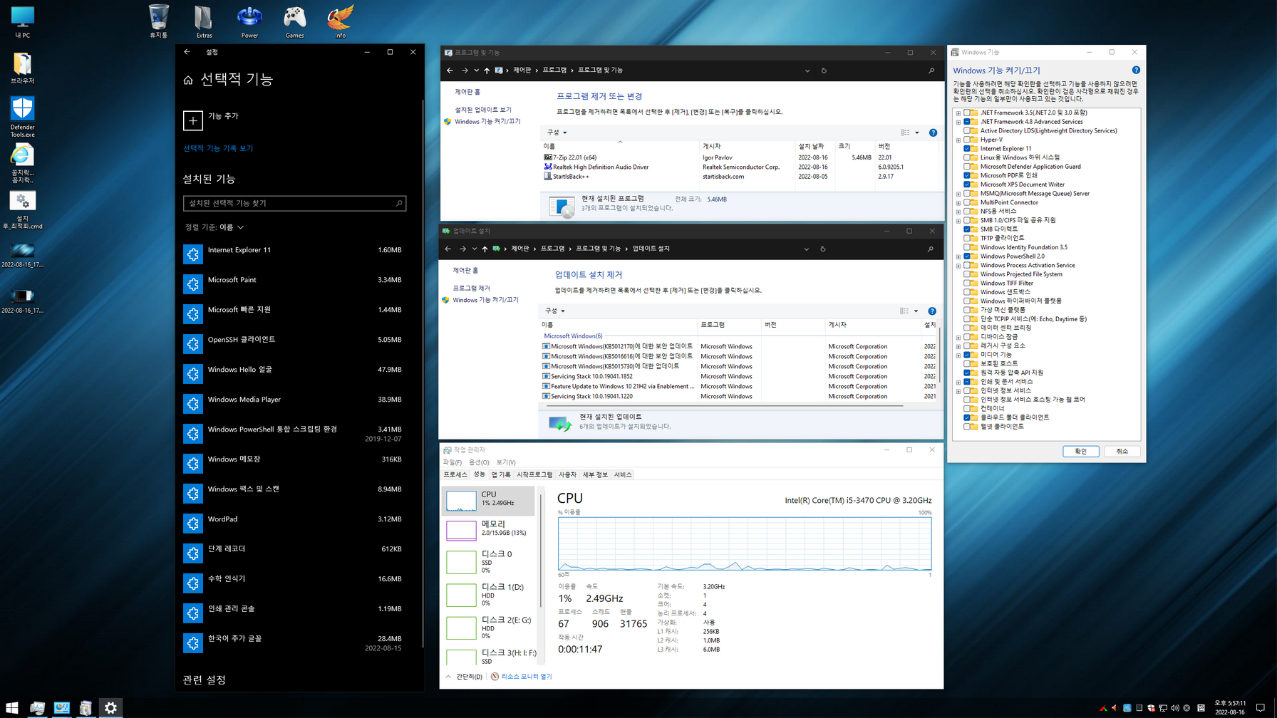 설치는 사용자 계정(오프라인)과 Admin(Administrator) 계정으로 설치할 수 있으며, 용량문제로 *****************.esd 이미지로 마무리합니다. 두 가지 계정 모두 첫 바탕화면 진입 후, 한국어 설정 마무리와 제작자 트윅 문제로 30초 뒤에 재부팅이 됩니다. 그리고 8월 누적 업데이트의 마무리를 위해 설정에서 업데이트를 한번 진행하여 설치를 마무리하시면 됩니다.