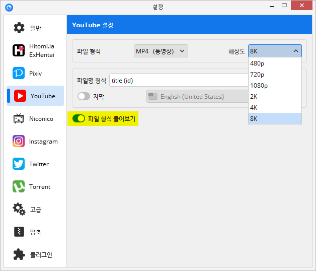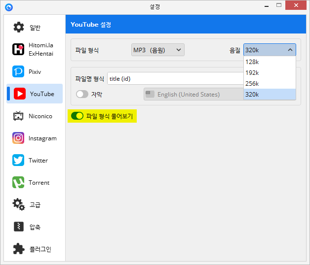 - 다운로드 사이트의 특징에 따라 다운로드 환경을 설정. 유튜브의 경우에는 동영상과 MP3 다운로드할 수 있는데, 다운로드 시 이 부분을 결정하고 싶으면 '파일 형식 물어 보기'를 활성화하면 됨.