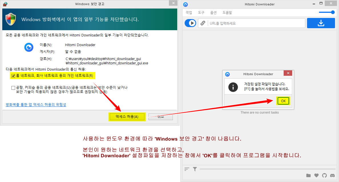 사용하는 윈도우 환경에 따라 'Windows 보안 경고' 창이 나옵니다. 본인이 원하는 네트워크 환경을 선택하고, 그 다음 'Hitomi Downloader' 설정파일이 없다는 창에서 'OK'를 버튼을 클릭하여 시작합니다.
