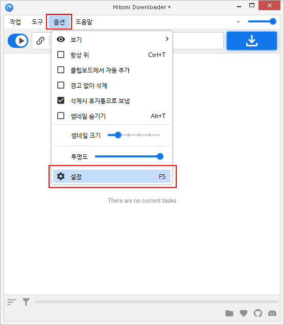 - 옵션 → 설정(또는 F5)에서 다운로드 저장 폴더 및 필요한 기본 환경을 본인에게 맞게 설정
