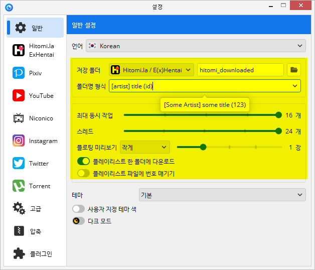 - 최대 다운로드를 할 수 있는 갯수는 16개가 최대이고, 다운로드 시 속도를 조정할 수 있는 스레드는 24개 최대임. 스레드는 작게하면 다운로드 속도가 떨어질 수 있고, 사용하는 컴의 환경에 따라 24개를 유지하면 오히려 속도가 저하될 수 있음.