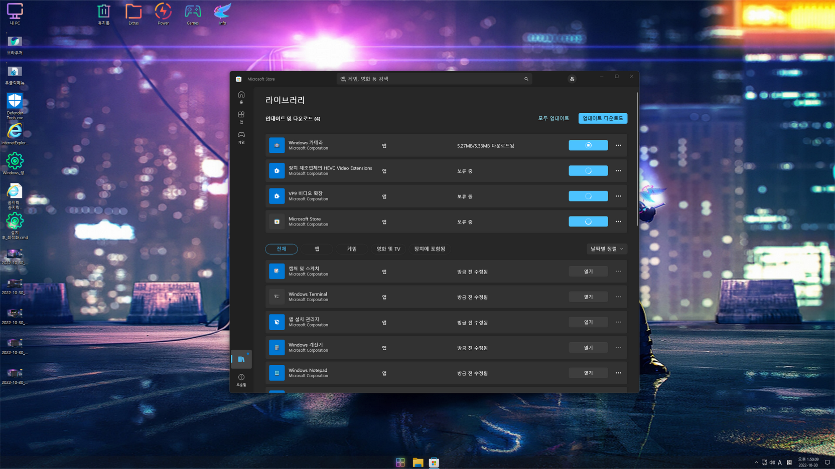 오프라인 한글화 작업이고, 무봉인 윈도우라 한국어 설정을 일부 마무리할 수 없었습니다. 한국어 설정을 위해 첫 바탕화면 진입 후 바로 배치파일이 실행되고, 10초 후에 재부팅이 됩니다. 재부팅 후에는 스토어 앱을 실행한 다음, 아래 캡쳐 이미지를 참고하여 'UWP 및 시스템 앱'의 '모든 업데이트'를 선택하여 한국어를 적용합니다. 즉, 계산기 / 그림판 / 메모장 / 캡쳐 도구 / 카메라 / 터미널 앱 및 우클릭 메뉴가 한국어로 적용입니다.