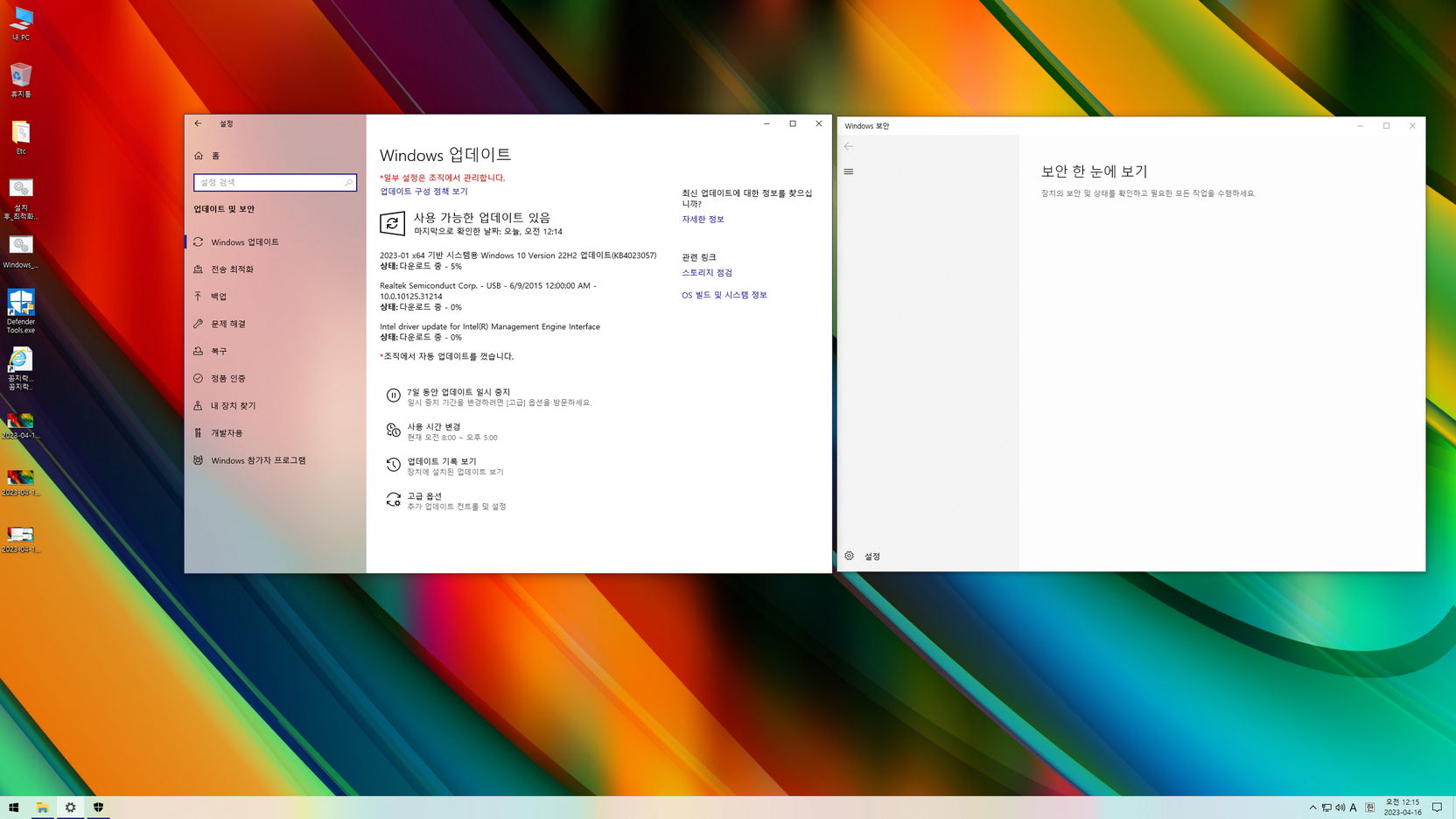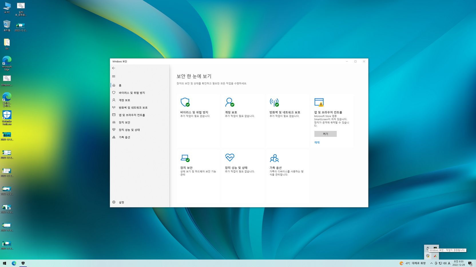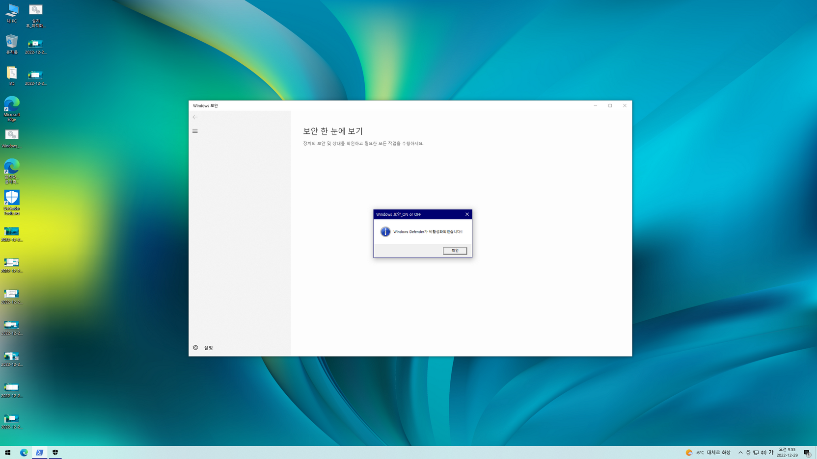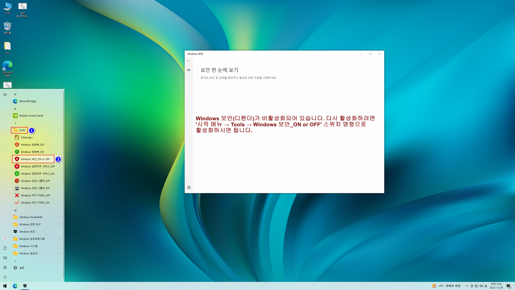 - 디펜더 비활성화(시작메뉴 Tools 폴더에서 'Windows 보안_ON or OFF' 스위치 명령어로 활성화 또는 비활성화)