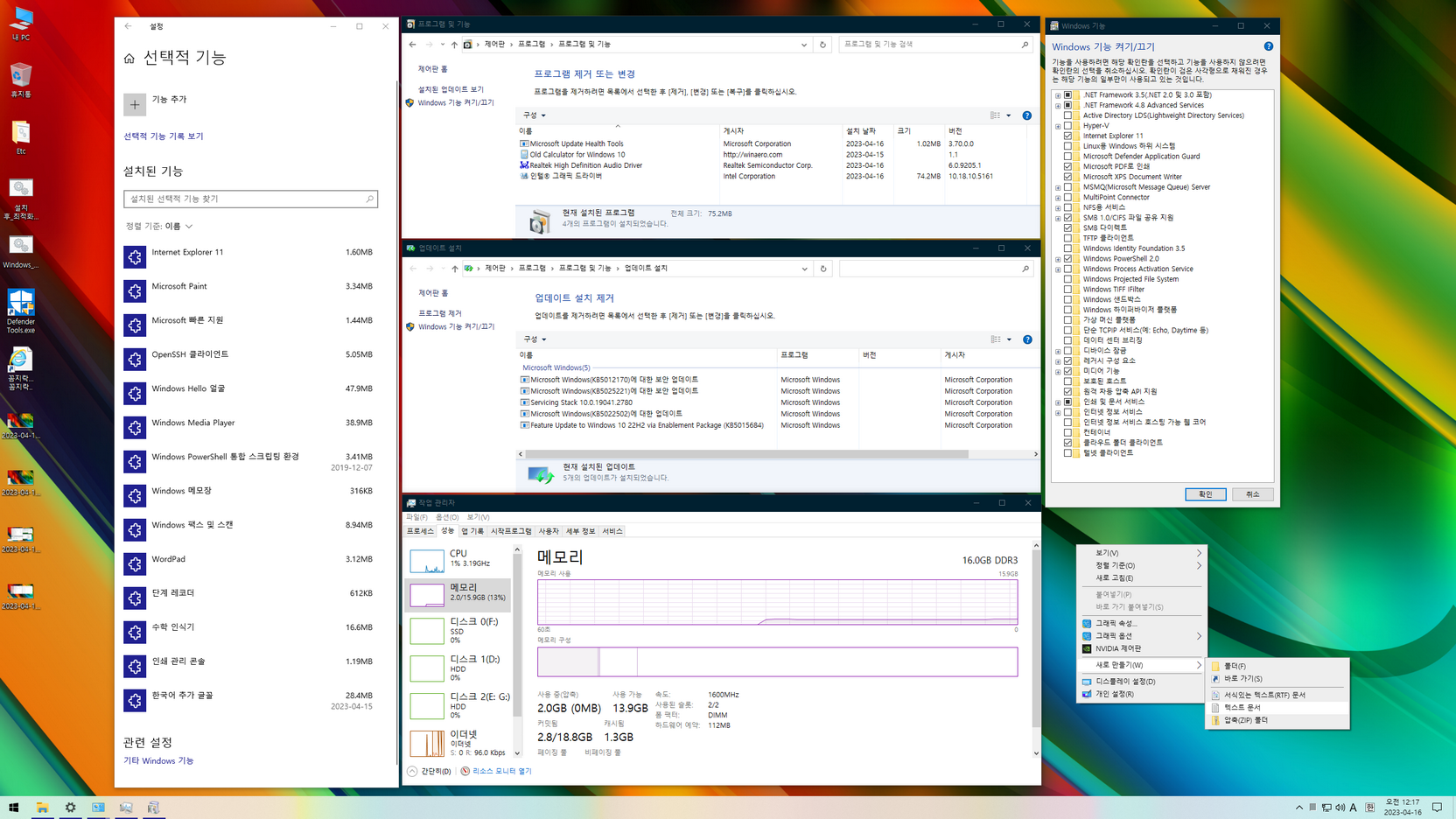 작업표시줄 '뉴스 및 관심사' 활성화(엣지 브라우저를 설치하면 활성화됨)- 닷넷 3.5 / SMB1.0 / 레거시 구성 요소 기능 활성화