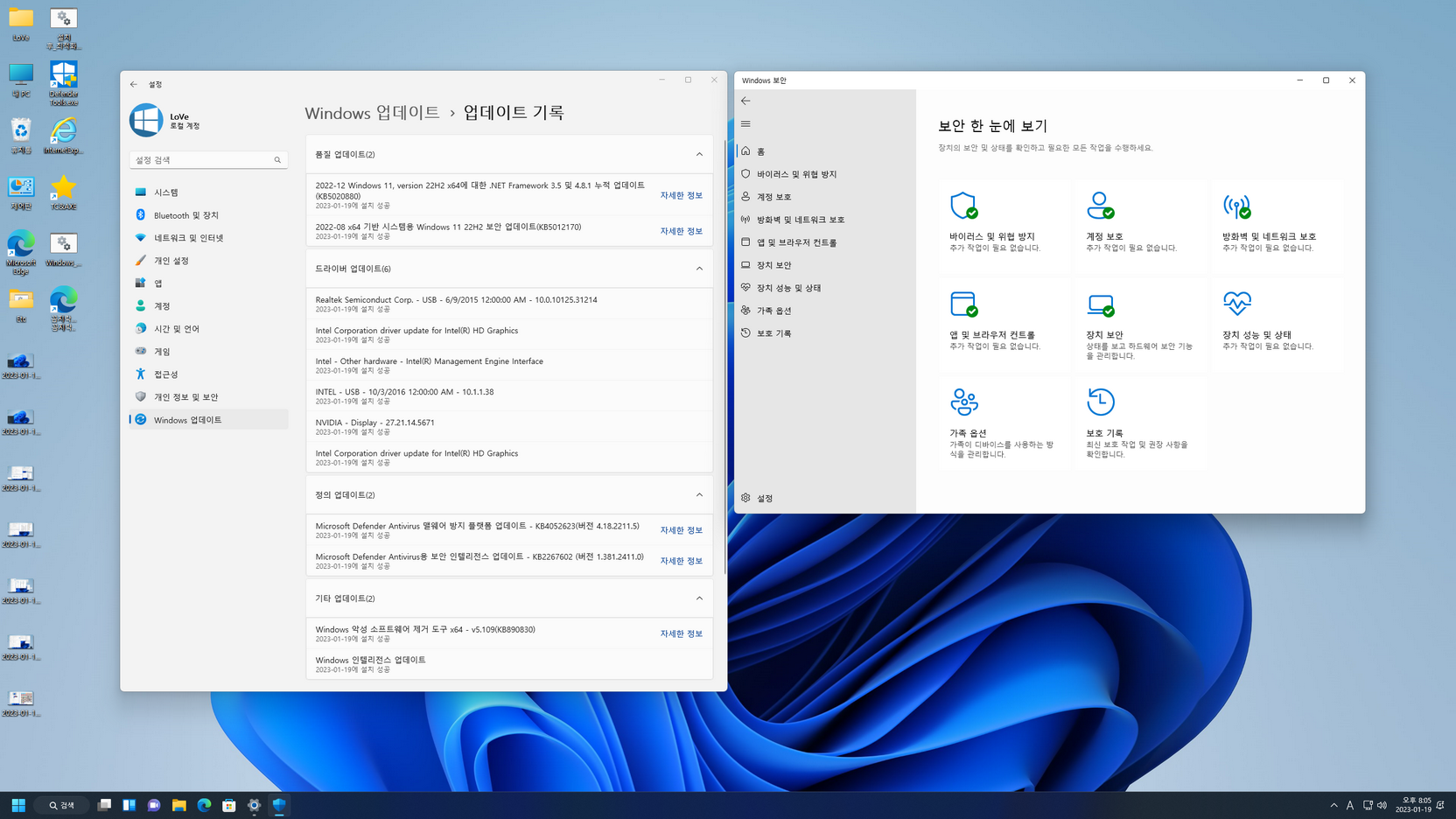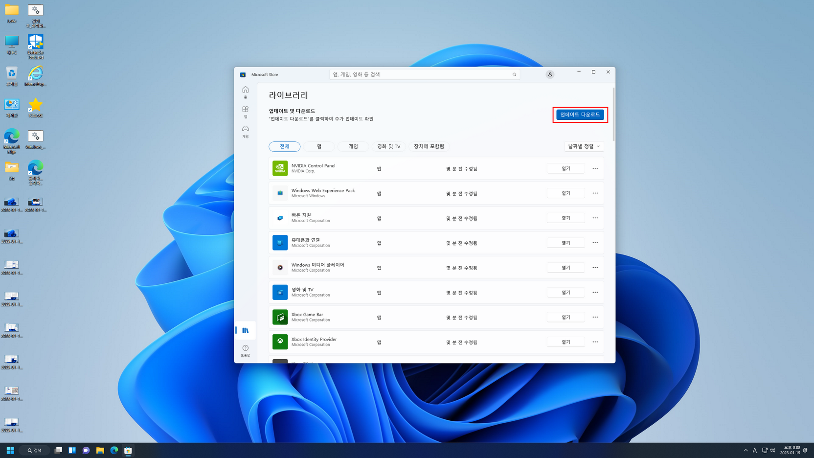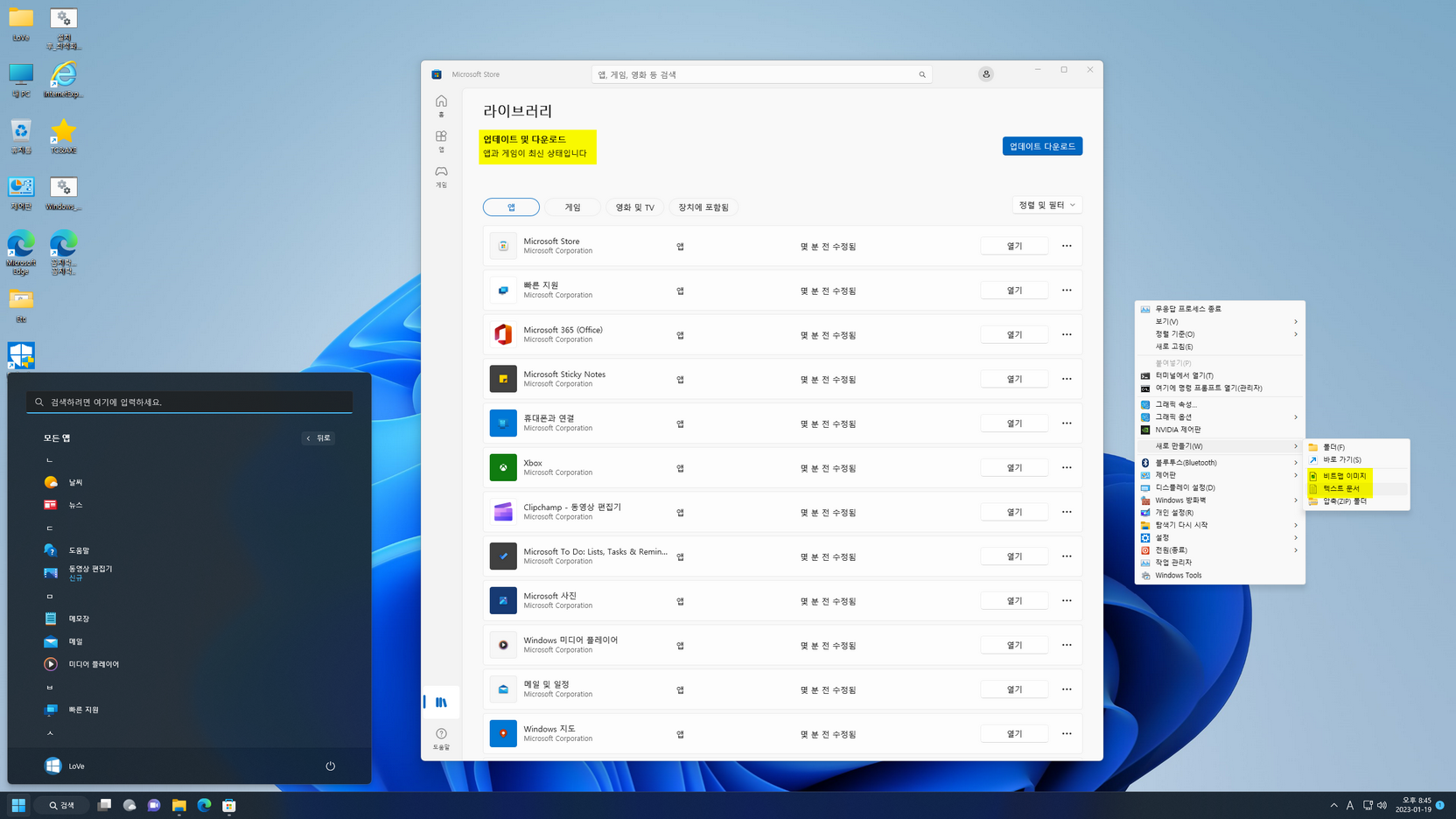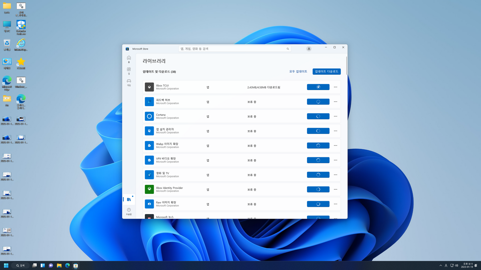 첫 바탕화면 진입 후, Mozilla Firefox 브라우저 삭제에 대한 배치파일이 실행되고, 작업이 끝나면 10 초 뒤에 시스템이 재부팅됩니다. 재부팅 후에는 UWP 앱들의 한국어 적용을 위해, 아래 캡처 이미지를 참고하여 앱들을 업데이트해 줍니다.