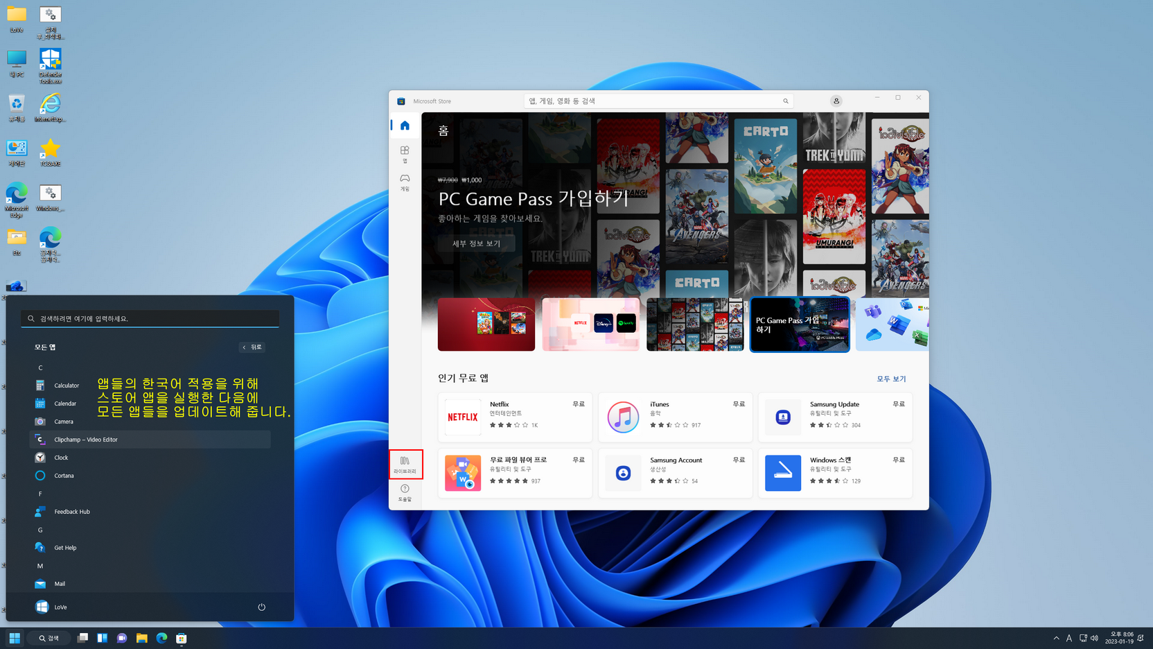 오프라인 한국어 작업이라 UWP 앱들이 영어로 나옵니다. 이 부분을 해결하기 위해 스토어 앱을 실행한 다음, 라이브러리 메뉴에서 모든 앱들을 업데이트합니다.