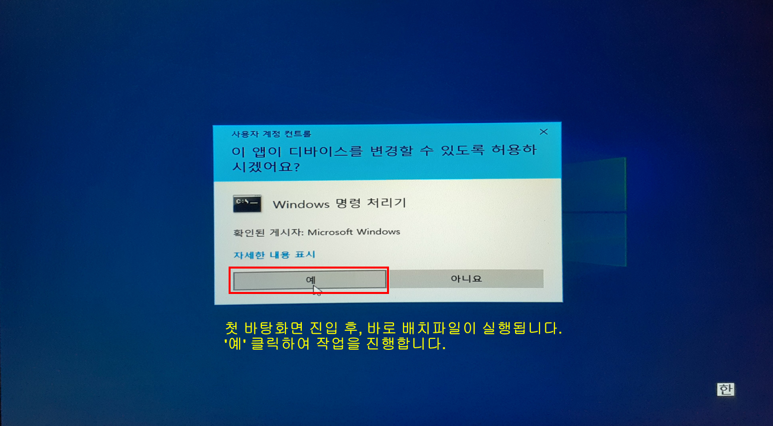 오프라인 한글화 작업이라 한국어 작업을 마무리할 수 없었습니다. 그래서 첫 바탕화면 진입후, 한국어 적용 및 제작자 설치 프로그램 잔재 삭제용 배치파일이 자동으로 실행됩니다. 이때 보안 문제로 메시지 창이 나오면 승인하여 진행합니다.