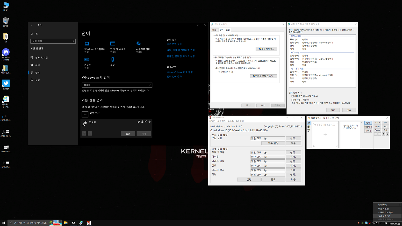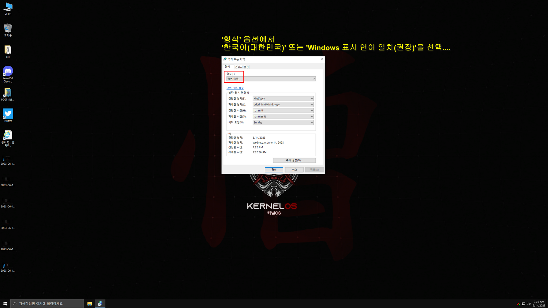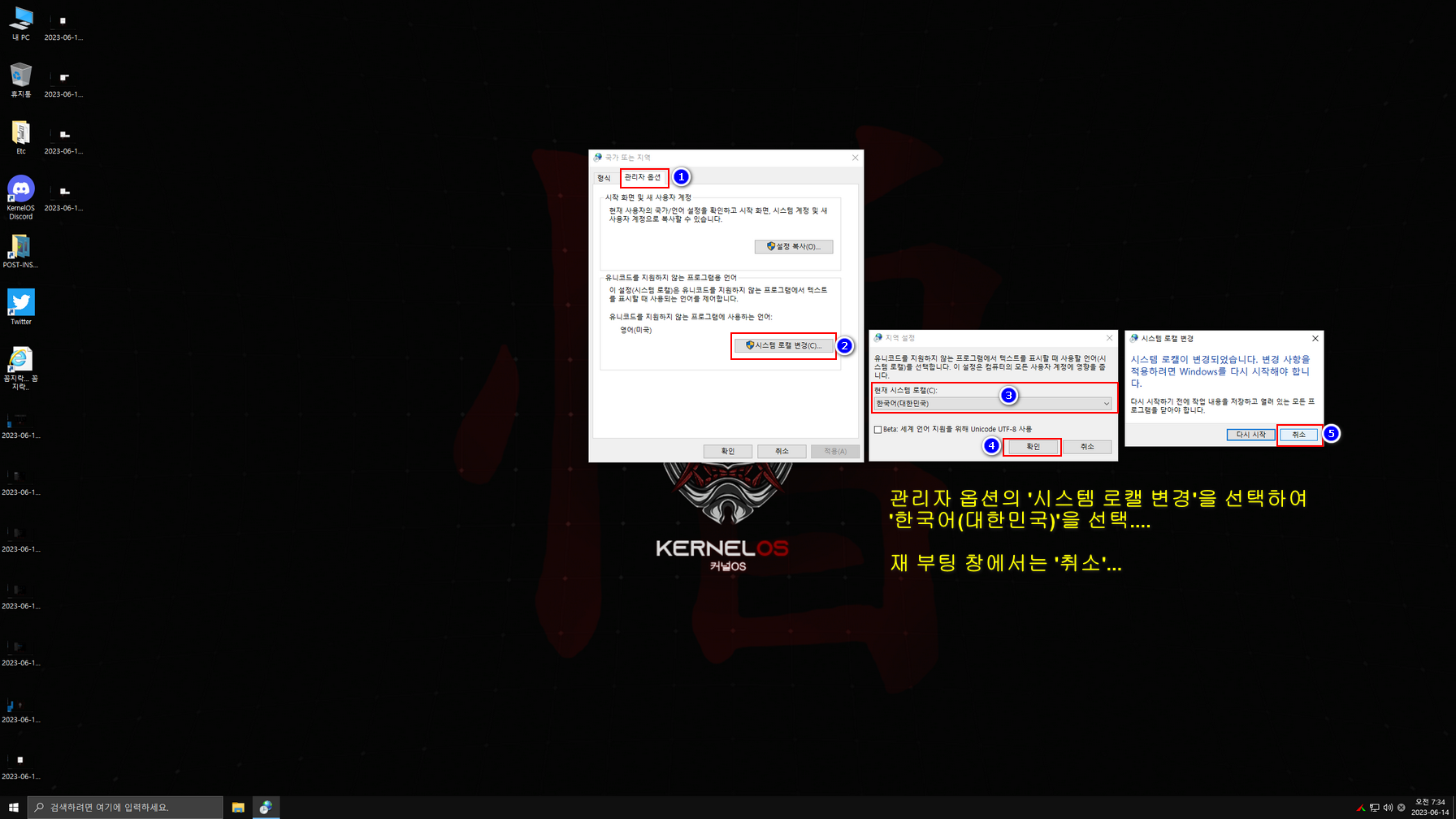 윈도우 설치는 대부분 한국어로 설치되나 제작자 배치파일 실행때문에 일부분이 영어로 설정되게 했습니다. 바탕화면 두 번째 진입 시 한국어 배치 파일이 실행된 다음에, 한국어와 관련된 설정을 아래 캡처 이미지를 참고하여 설정하시면 됩니다. 설정을 모두 마친 후에는 다시 한번 재시동하여 사용하면 됩니다.