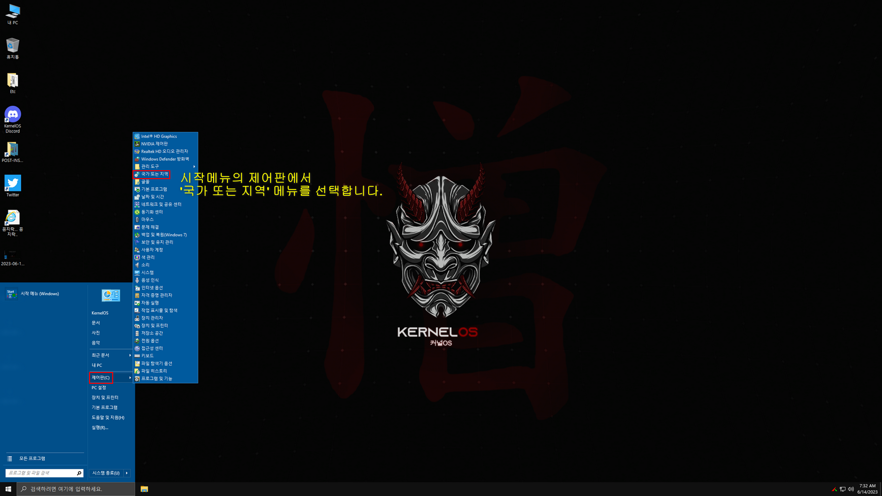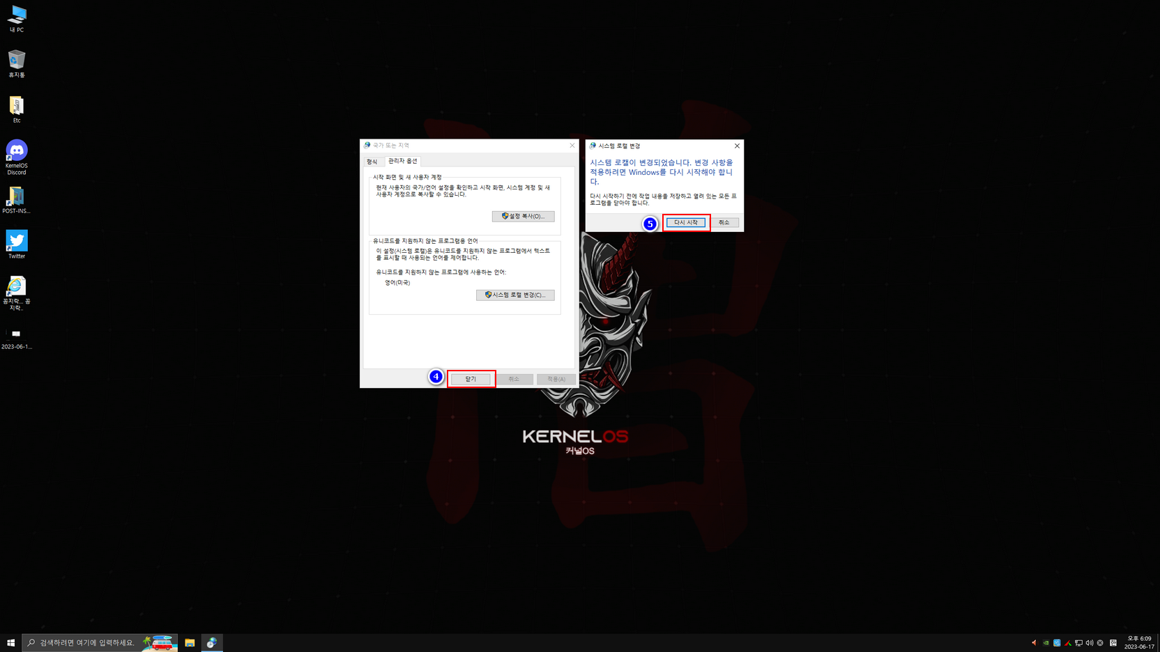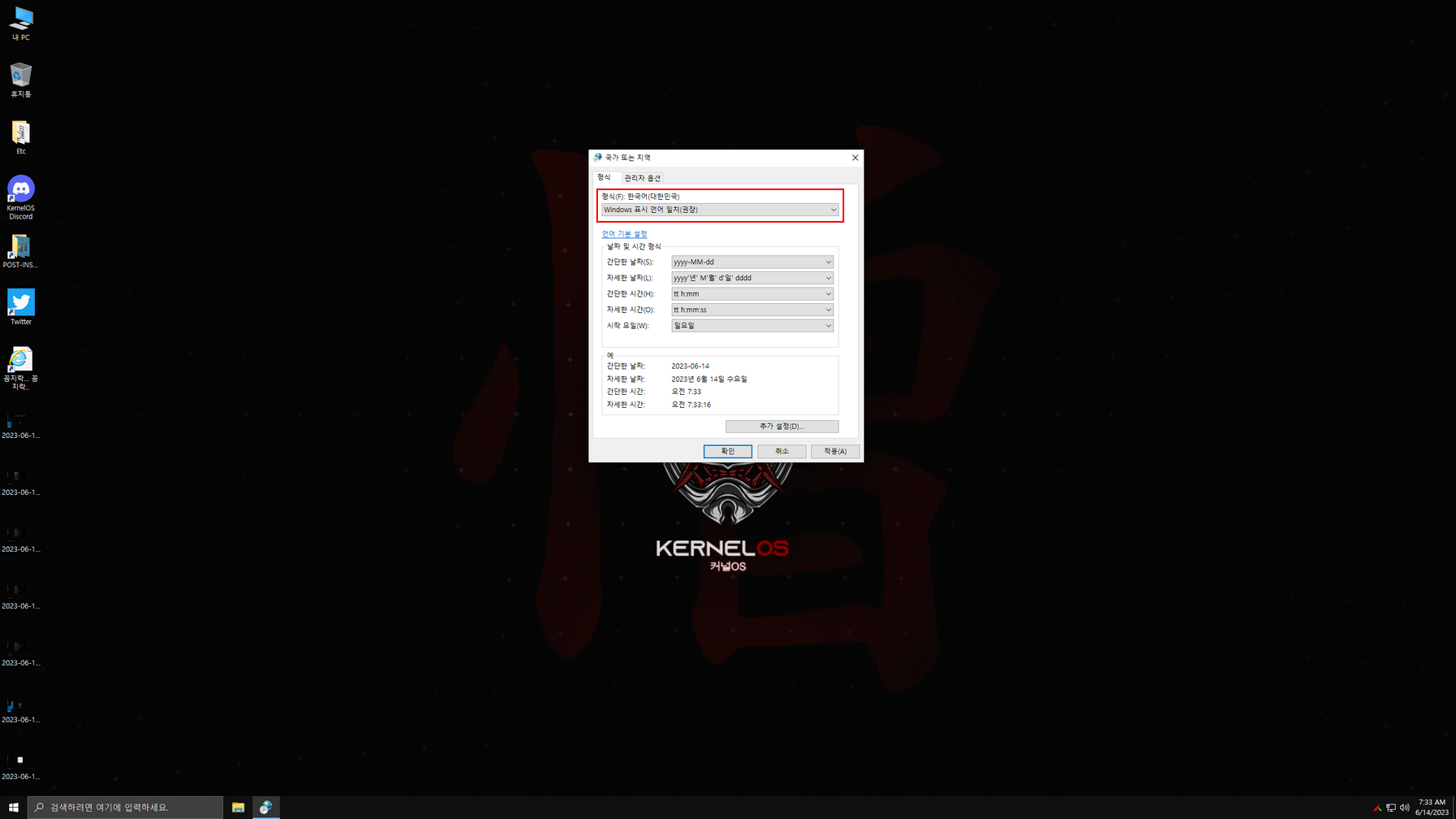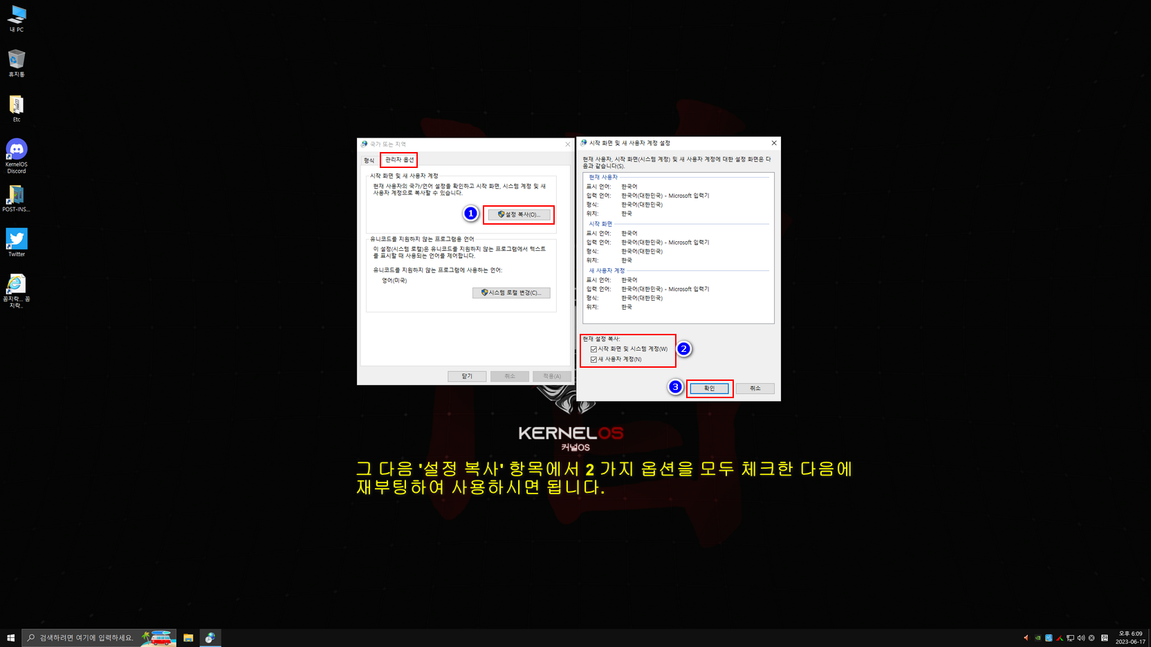 윈도우 설치는 대부분 한국어로 설치되나 제작자 배치파일 실행때문에 일부분이 영어로 설정되게 했습니다. 바탕화면 두 번째 진입 시 한국어 배치 파일이 실행된 다음에, 한국어와 관련된 설정을 아래 캡처 이미지를 참고하여 설정하시면 됩니다. 설정을 모두 마친 후에는 다시 한번 재시동하여 사용하면 됩니다.