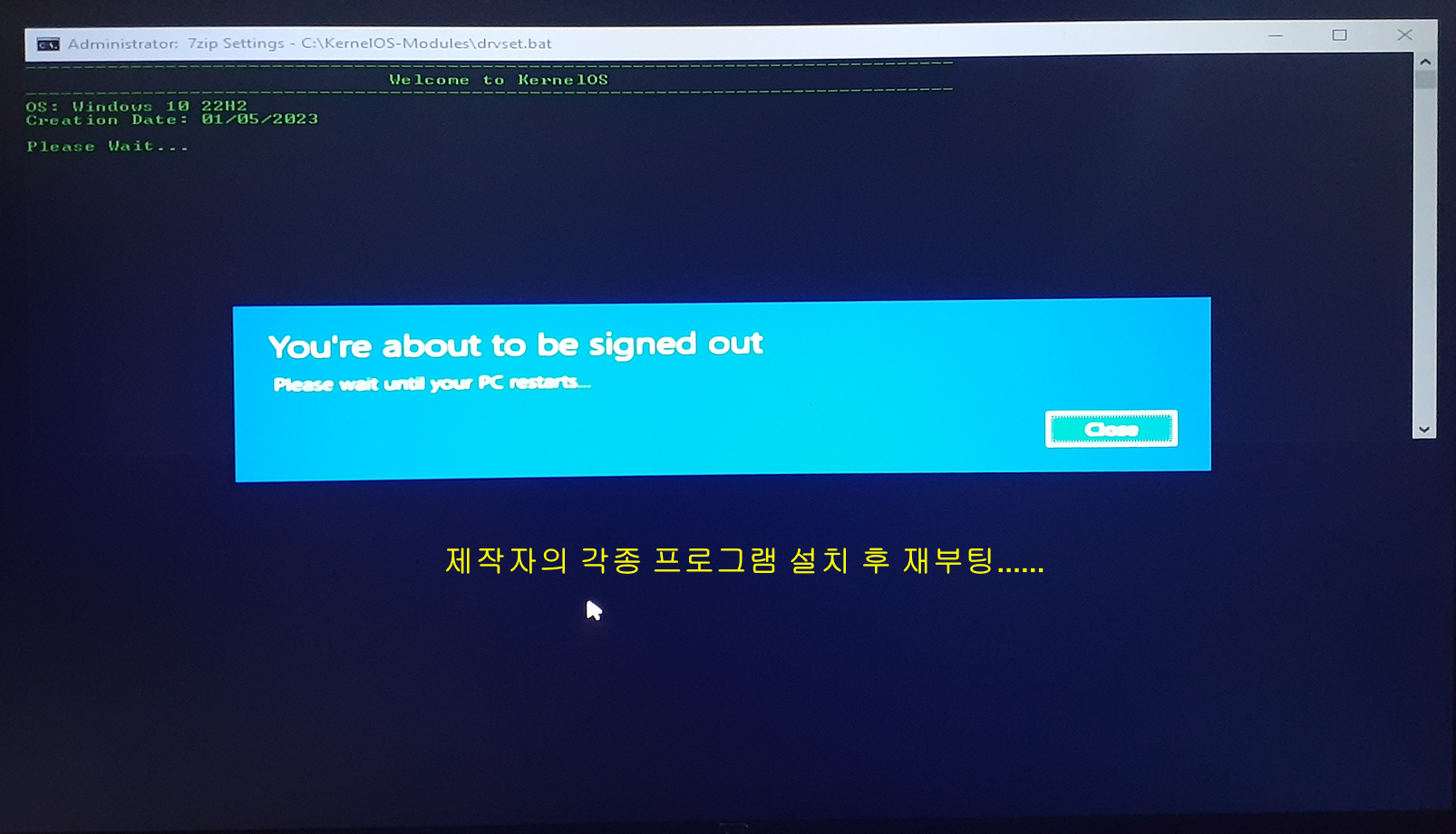 모든 작업은 오프라인 작업이라 첫 바탕화면 진입 시 제작자의 각종 셋팅 및 프로그램 설치관련 배치파일이 실행되고, 두 번째 바탕화면 진입 시 한국어와 관련된 배치파일이 실행됩니다. 그러니 바탕화면 진입 후에는 아무것도 만지지마시길 바랍니다.