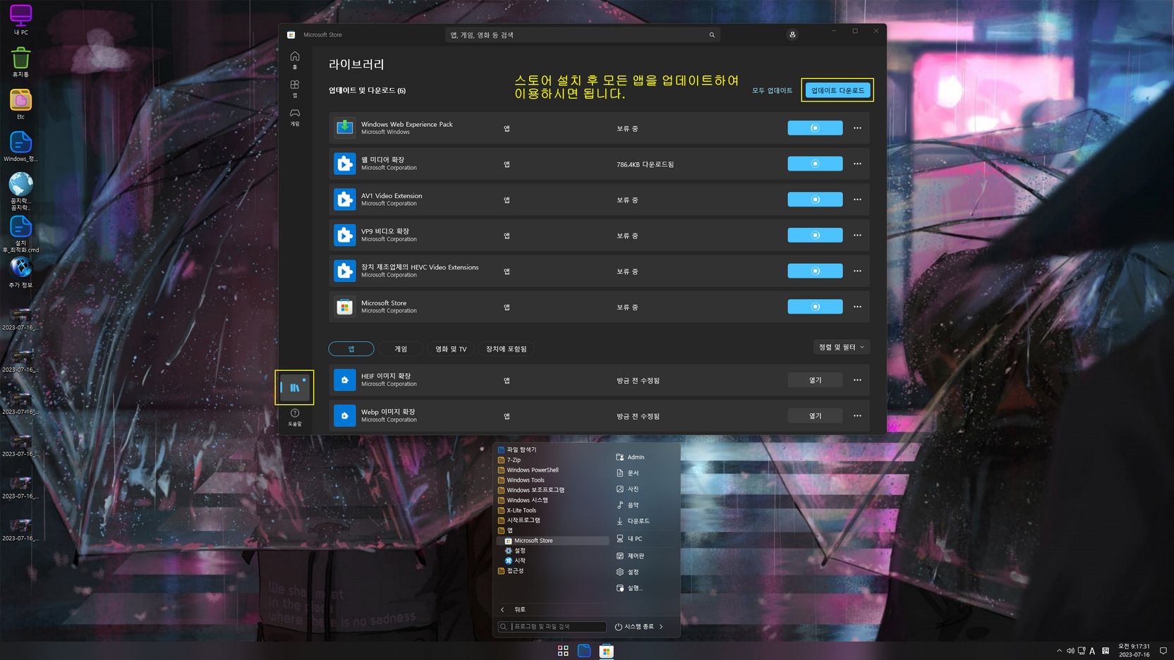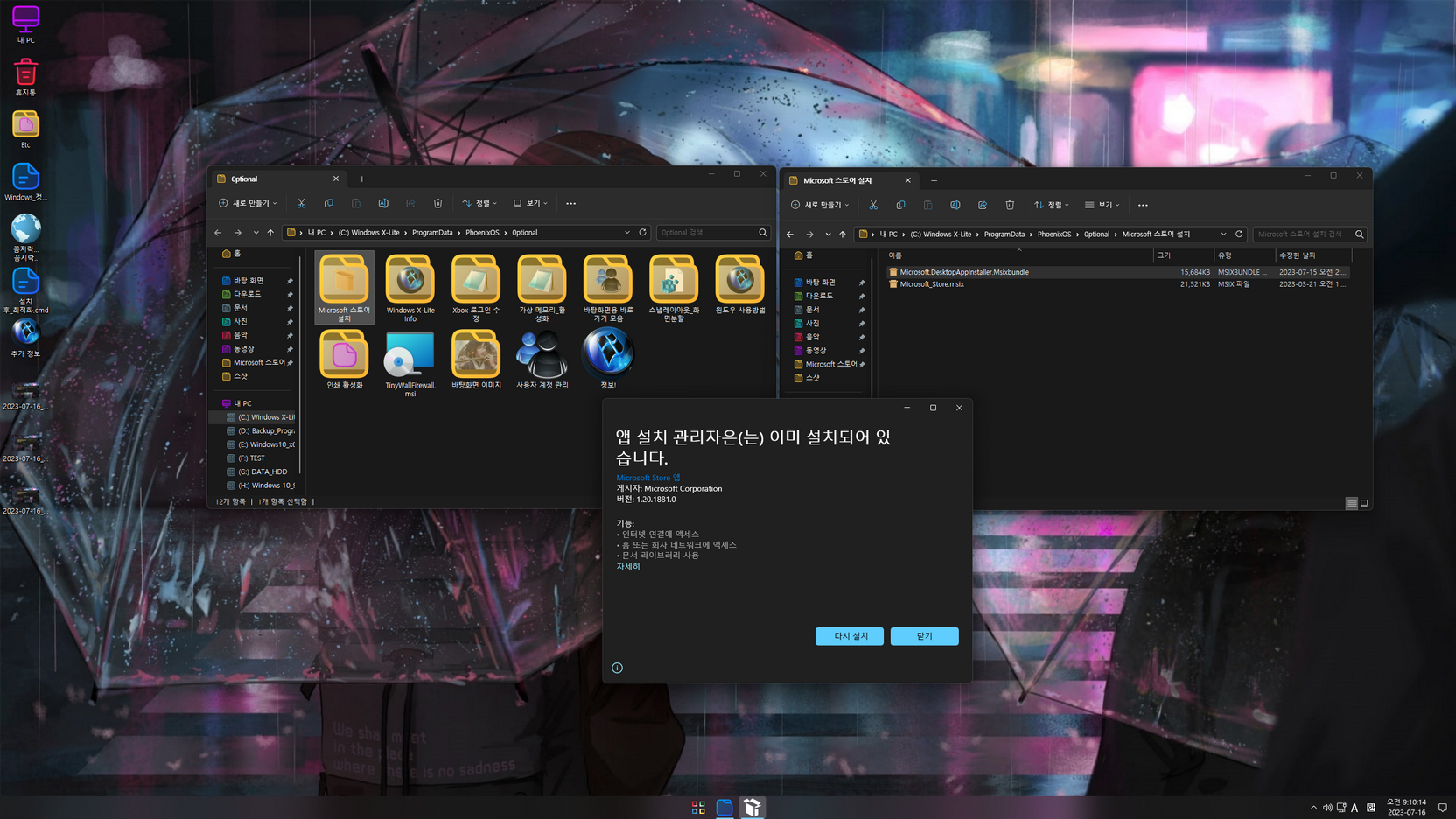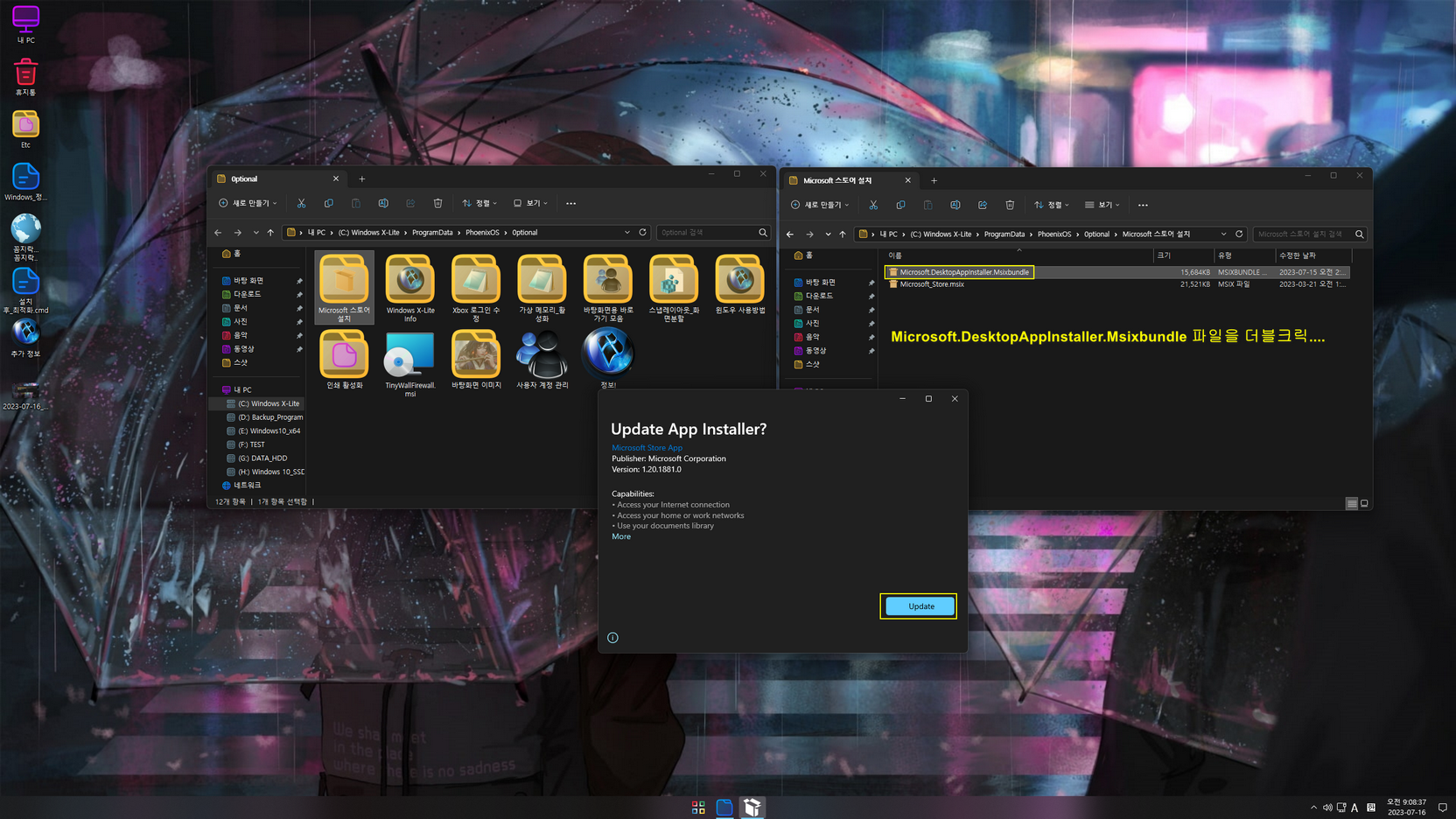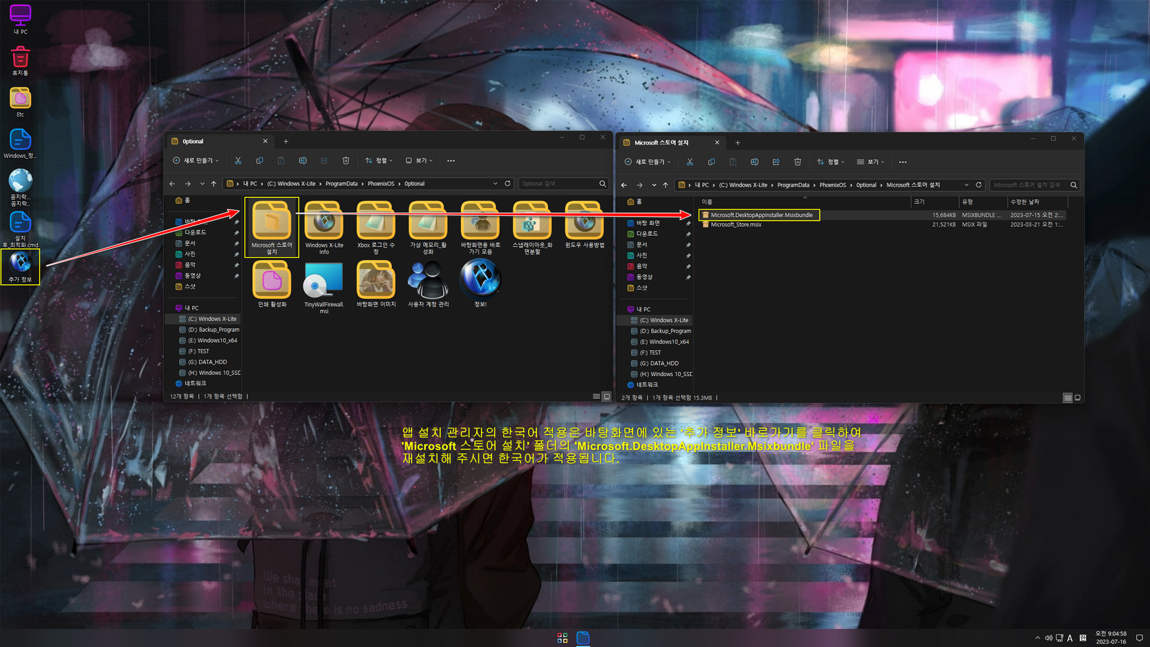 - 앱 설치 관리자 한국어 적용: 바탕화면에 있는 '추가 정보 → Microsoft 스토어 설치' 폴더에 있는 'Microsoft.DesktopAppInstaller.Msixbundle' 파일을 더블클릭하여 재설치