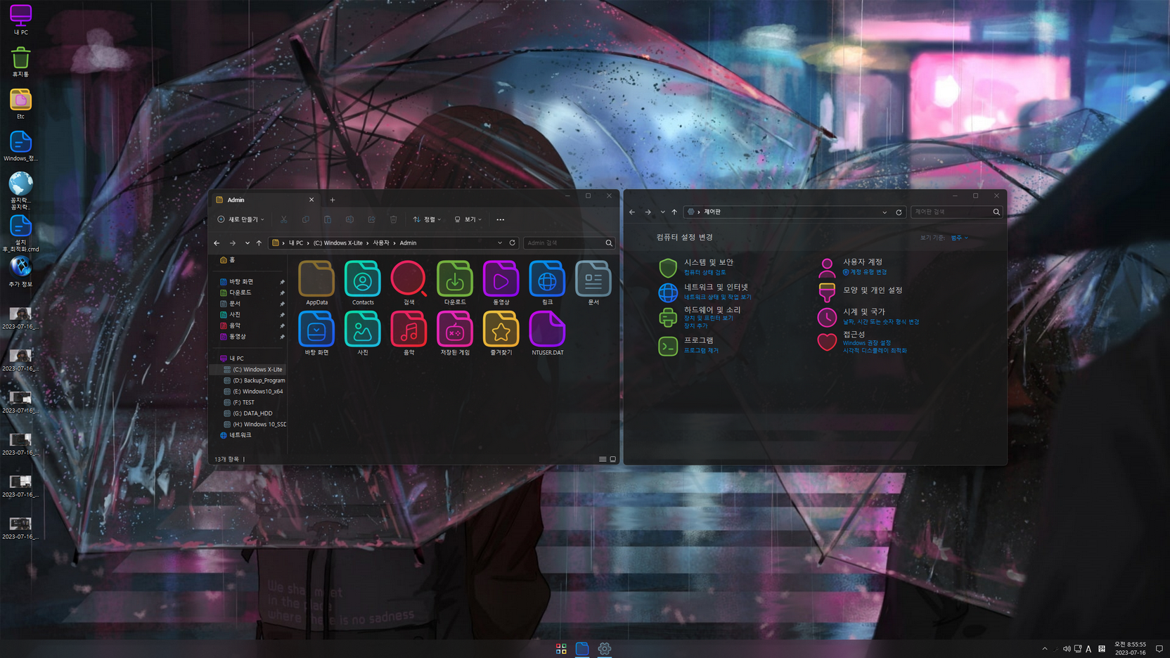 FBConan님 Windows 11 X-Lite SE(Windows 11 22H2 Pro_빌드 22621.1928) 버전의 지역화이며, 설치 시 컴팩트(Compact)압축 적용으로 설치 시간이 조금 걸립니다. Admin(사용자 계정, 관리자 권한) 계정으로 무봉인된 윈도우이고, WinSXS 폴더가 최적화된 울트라라이트 버전입니다.