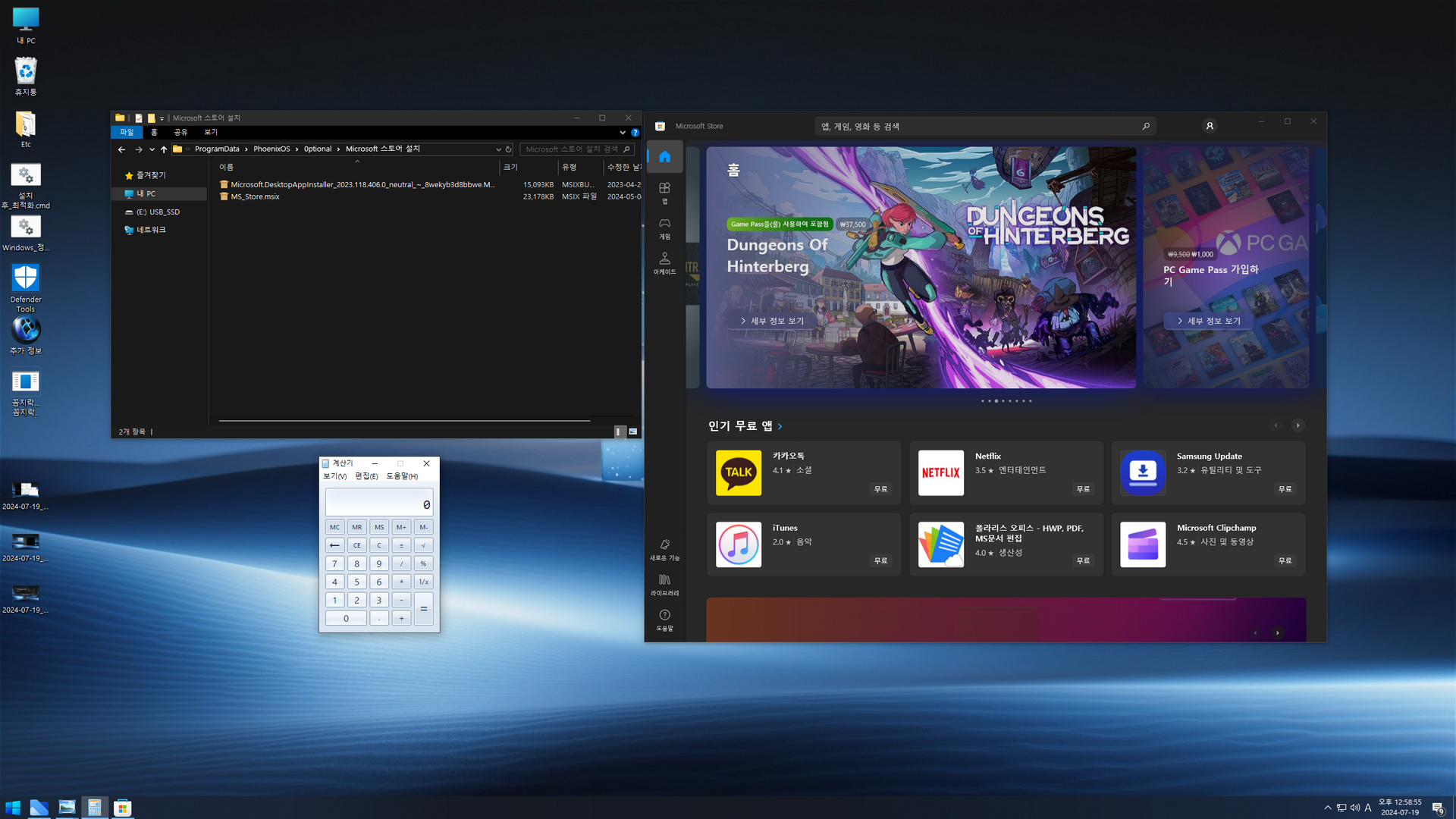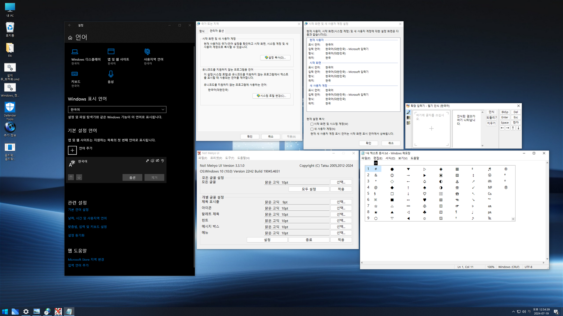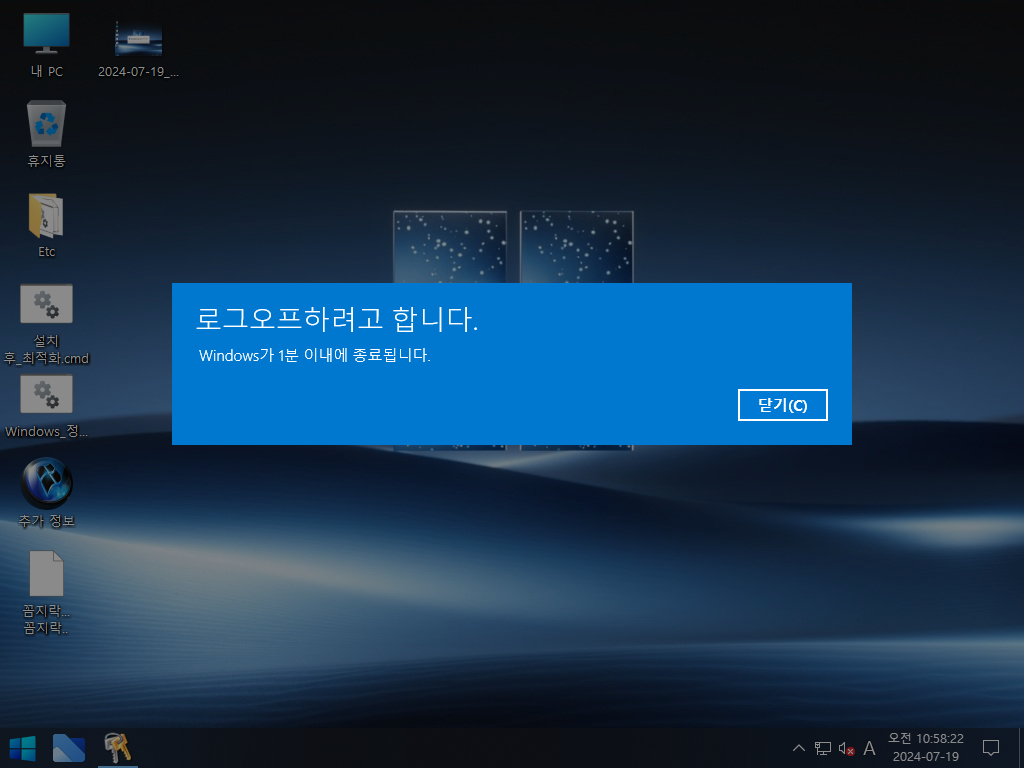 윈도우 설치는 디펜더 사용유무로 2 가지 에디션을 선택할 수 있습니다. 오프라인 한글화 작업이라, 제작자 무봉인 윈도우의 한국어 설정을 일부 마무리할 수 없었습니다. 한국어 설정을 위해 첫 바탕화면 진입 후에는 바로 배치파일이 실행되고, 10초 후 재부팅됩니다.