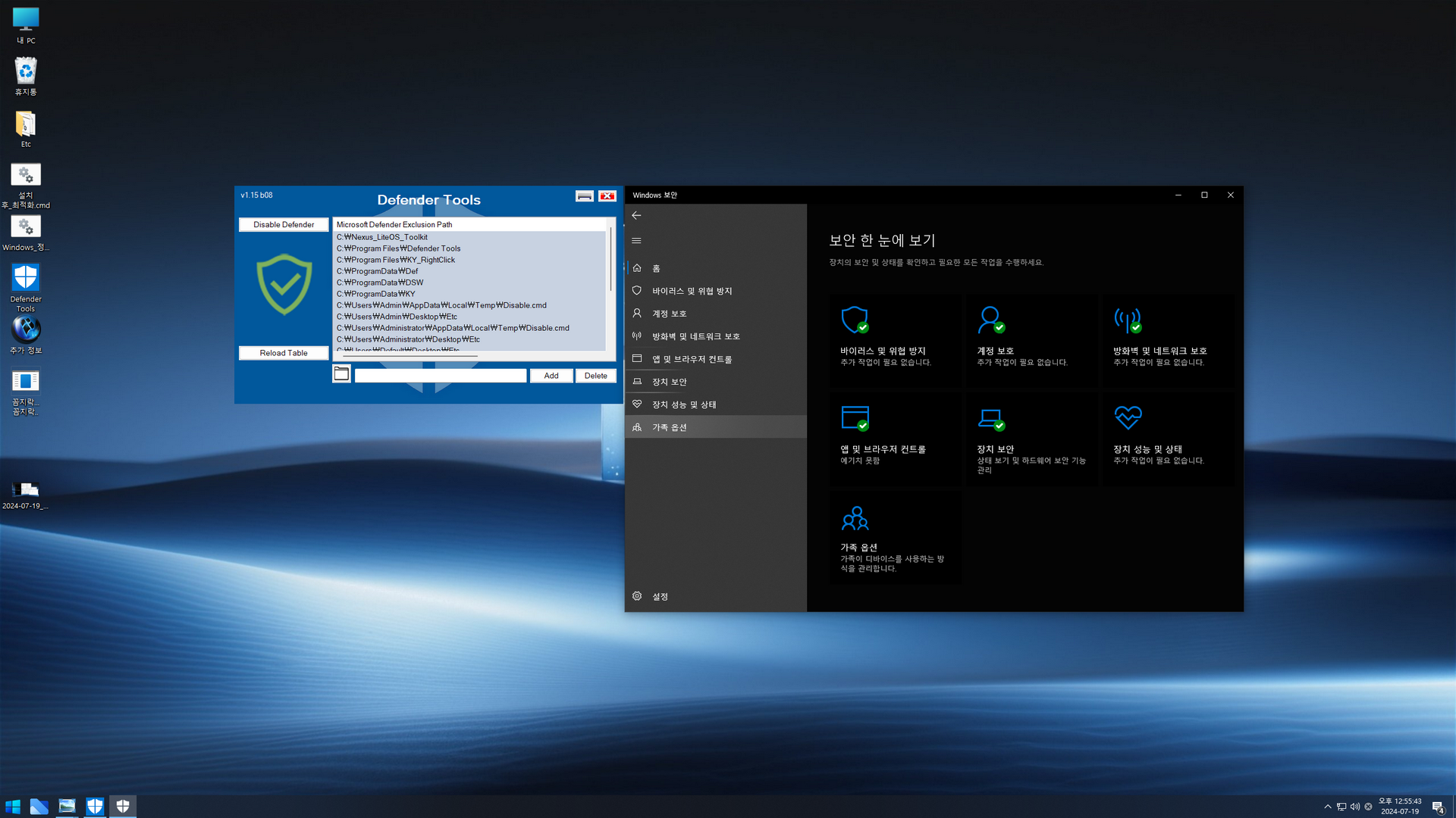 Index: 1 (사용자 Admin - 관리자 권한, 디펜더 비활성화)
