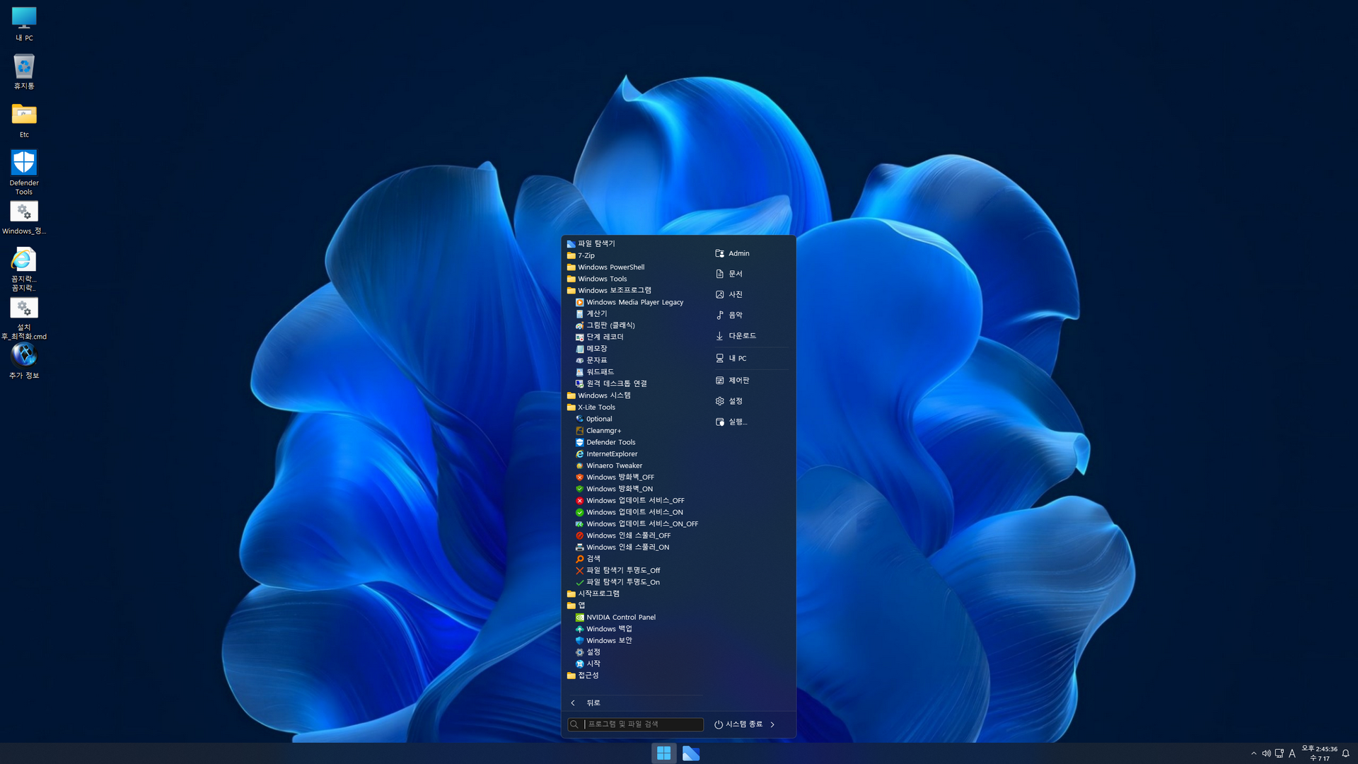 윈도우 설치는 디펜더 사용유무로 2 가지 에디션을 선택할 수 있습니다. 오프라인 한글화 작업이라, 제작자 무봉인 윈도우의 한국어 설정을 일부 마무리할 수 없었습니다. 한국어 설정을 위해 첫 바탕화면 진입 후에는 바로 배치파일이 실행되고, 10초 후 재부팅됩니다.