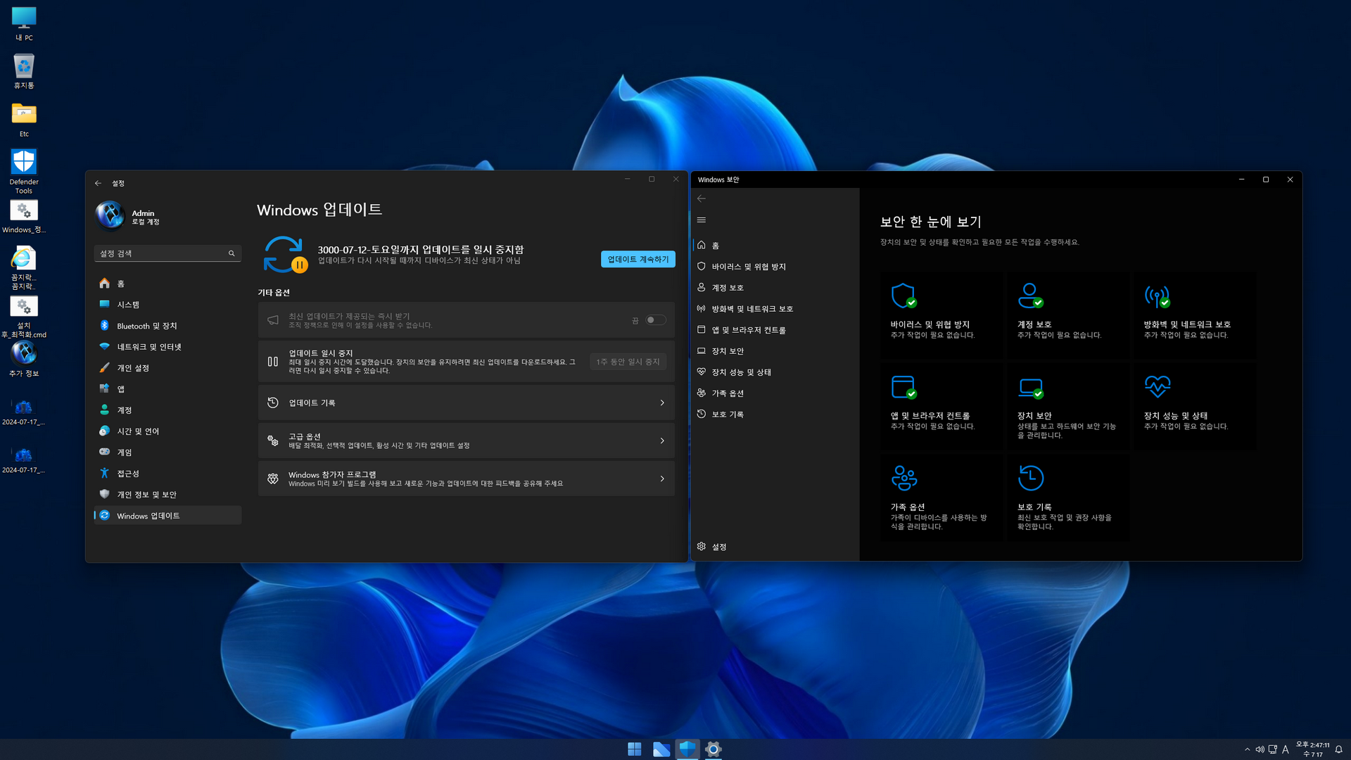 Index: 1 (사용자 Admin - 관리자 권한, 디펜더 비활성화)