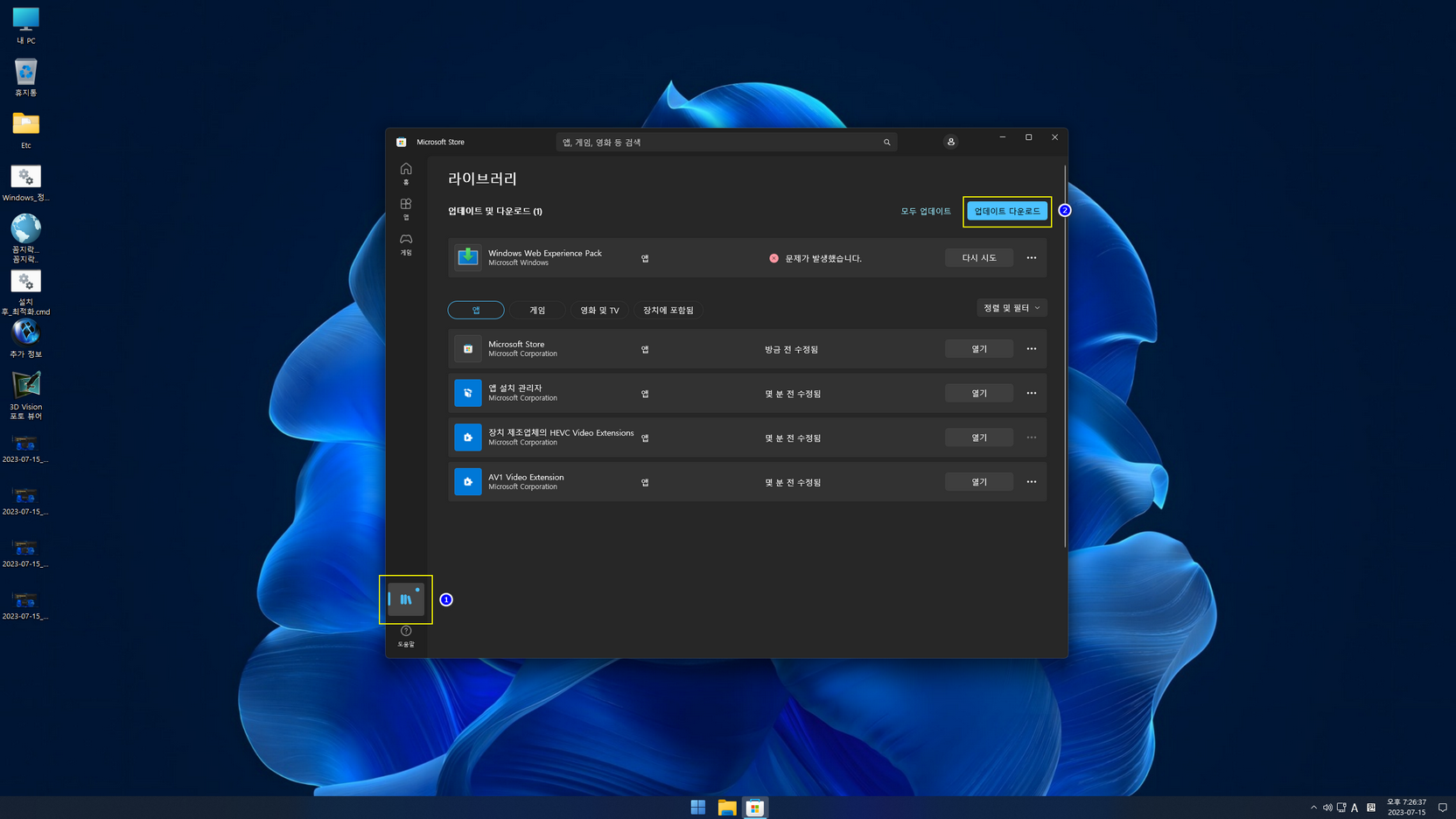 ▶ 방법 2. 바탕화면 'Etc' 폴더에 있는 'Misrosoft_Store_설치와 삭제_11용.7z' 압축 파일을 해제하여 스토어 앱을 추가