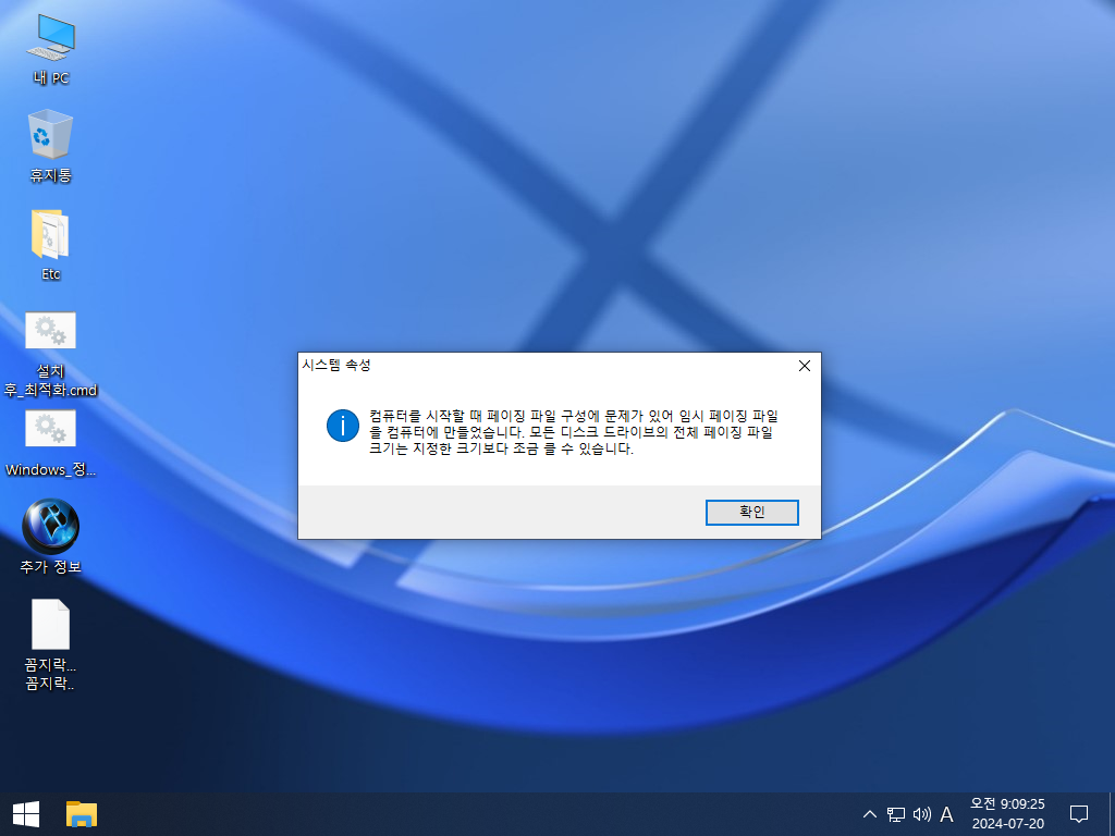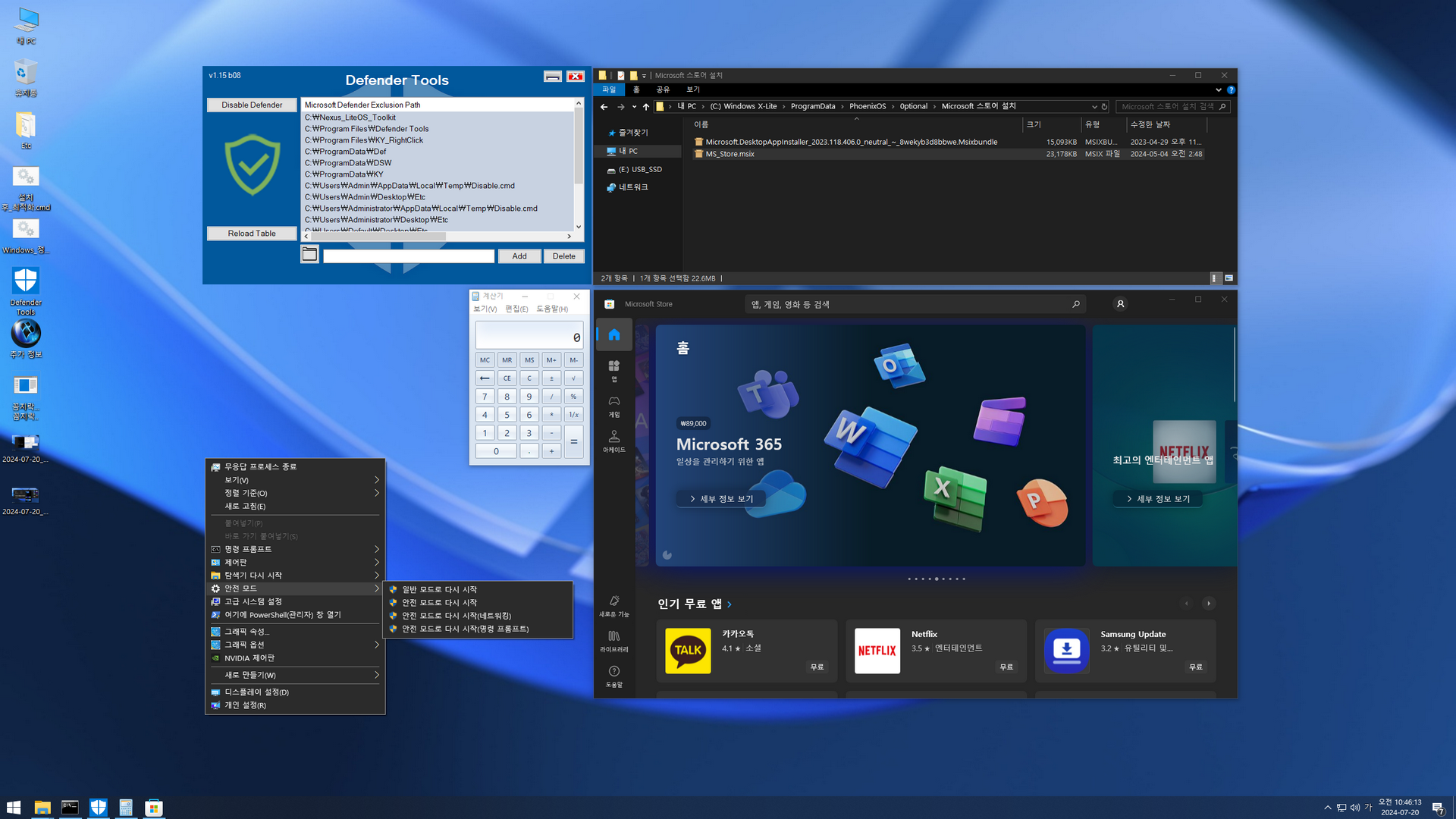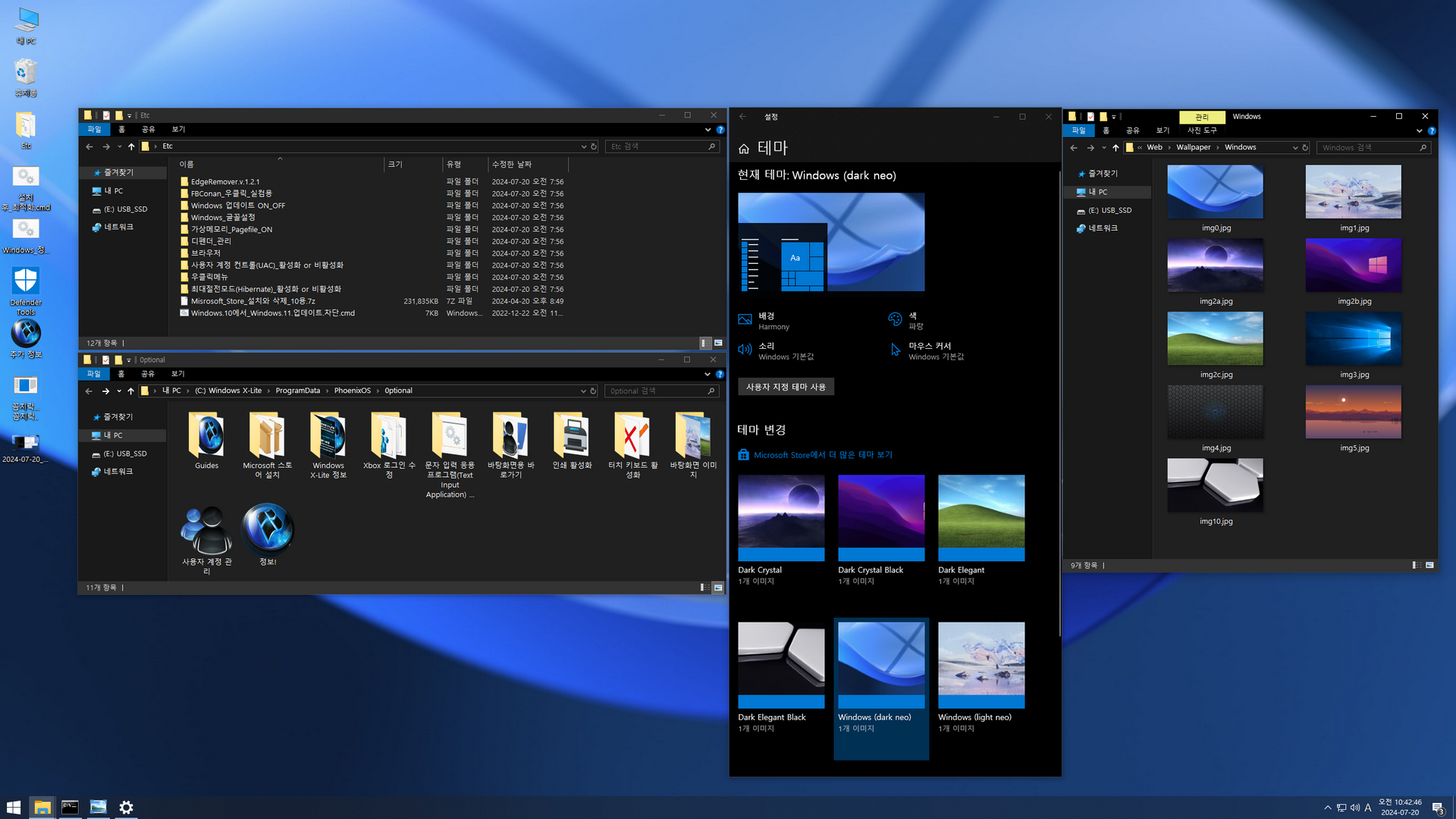 윈도우 설치는 디펜더 사용유무로 2 가지 에디션을 선택할 수 있습니다. 오프라인 한글화 작업이라, 제작자 무봉인 윈도우의 한국어 설정을 일부 마무리할 수 없었습니다. 한국어 설정을 위해 첫 바탕화면 진입 후에는 바로 배치파일이 실행되고, 10초 후 재부팅됩니다.