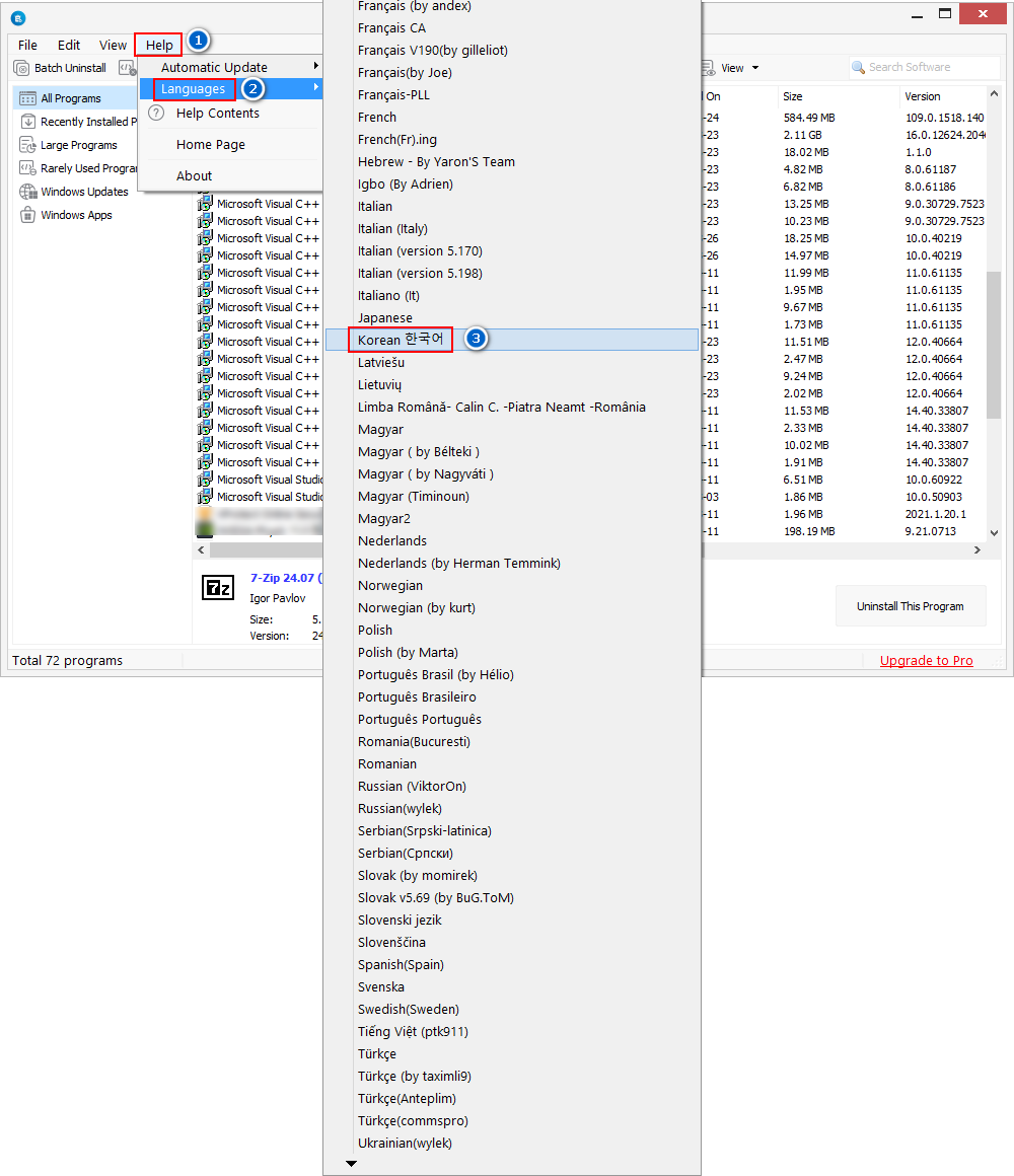 메뉴에서 'Help → Languages → Korean (한국어)'을 선택한 다음, 확인 창에서 '예'를 클릭합니다. 그러면 프로그램이 다시 시작하고 한국어로 표시가 됩니다.