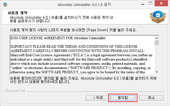 - 라이센스 창에서 '동의함'을 클릭합니다.